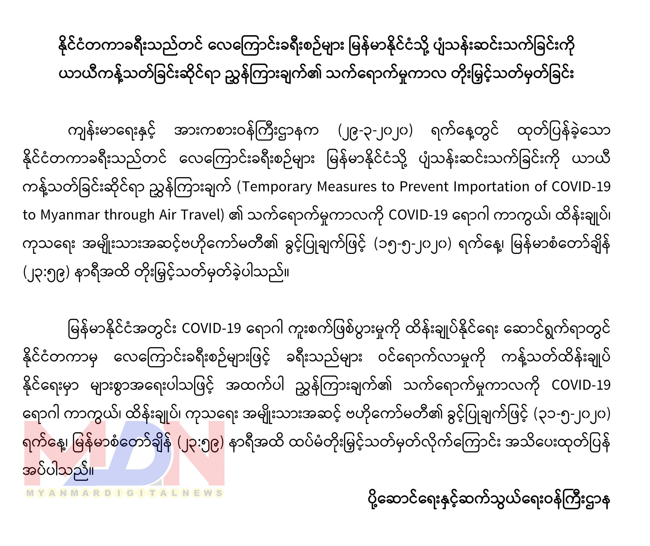 နိုင်ငံတကာခရီးသည်တင် လေကြောင်းခရီးစဉ်များ မြန်မာနိုင်ငံသို့ ပျံသန်းဆင်းသက်ခြင်းကို ယာယီကန့်သတ်ခြင်းဆိုင်ရာ ညွှန်ကြားချက်၏ သက်ရောက်မှုကာလ တိုးမြှင့်သတ်မှတ်
