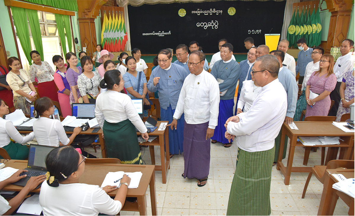 ၎င်းနောက် ပြည်ထောင်စုရာထူးဝန်အဖွဲ့ ဥက္ကဋ္ဌသည် အဖွဲ့ဝင်များဖြစ်သည့် ဦးရဲနိုင်၊ ဦးစိုးတင့်၊ ညွှန်ကြားရေးမှူးချုပ်များ၊ တာဝန်ရှိသူများနှင့်အတူ Digital စနစ်ဖြင့် ဝန်ထမ်းကိုယ်ရေးအချက်အလက်များ လက်တွေ့ဖြည့်သွင်း ဆောင်ရွက်လျက်ရှိသည့် အခြေအနေများကို လိုက်လံကြည့်ရှု အားပေးခဲ့ကြောင်း သိရသည်။