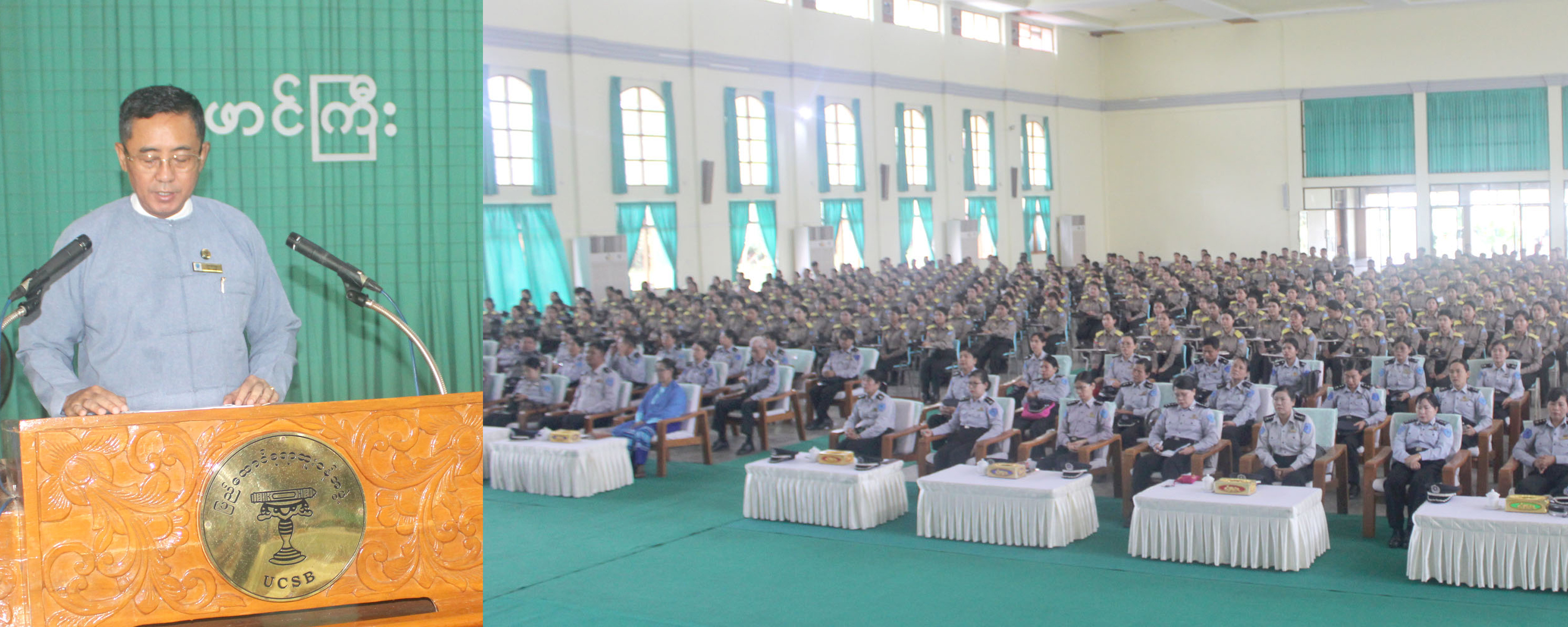 ဦးစွာ ပါမောက္ခချုပ် ဦးကျော်ထွေးက သင်တန်းသား၊ သင်တန်းသူများအနေဖြင့် နိုင်ငံ့ဝန်ထမ်းတက္ကသိုလ်က ချမှတ်ထားသည့် သင်တန်းဆိုင်ရာစည်းမျဉ်း၊ စည်းကမ်းများကို လိုက်နာပြီး မိမိဝန်ကြီးဌာန၏ဂုဏ်ကို ဆောင်နိုင်သူများဖြစ်အောင် ကြိုးစားသွားကြရန် တိုက်တွန်းမှာကြားလိုကြောင်း ပြောကြားသည်။