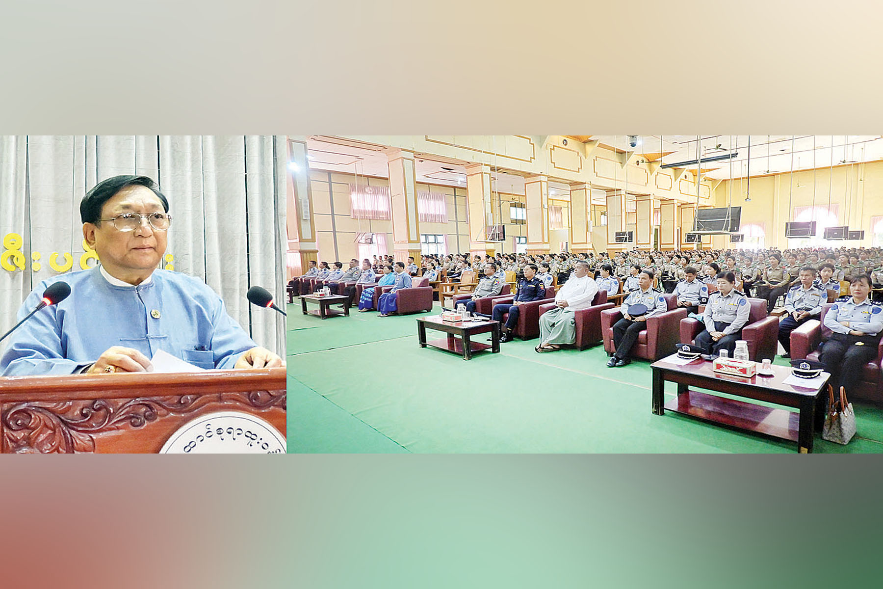 ဦးစွာ ပြည်ထောင်စုရာထူးဝန်အဖွဲ့ဝင် ဦးကျော်မျိုးထွဋ်က ဆရာဆရာမများသည် နိုင်ငံသားများ ဖြစ်သည့်အပြင် နိုင်ငံ့ဝန်ထမ်း တာဝန်ကို ထမ်းဆောင်နေကြသူများဖြစ်သည့်အတွက် နိုင်ငံသားတိုင်း ထမ်းဆောင်ရမည့် တာဝန်၊ စောင့်ထိန်းရမည့် ကျင့်ဝတ်၊ လိုက်နာရမည့် စည်းကမ်းများ၊ တည်ဆဲဥပဒေများနှင့် ဝန်ထမ်းကျင့်ဝတ်အပါး(၃၀)ကို စောင့်ထိန်းလိုက်နာပြီး နိုင်ငံ့ဝန်ထမ်းသစ္စာအဓိဋ္ဌာန်(၆)ချက်ကို ဦးထိပ်ပန်ဆင်ကာ ပါတီနိုင်ငံရေးကင်းရှင်းကြရန်နှင့် “နိုင်ငံတော်ဖွံ့ဖြိုးဖို့ ပညာရေးကို အားပေးစို့” ဆိုသည့်ဆောင်ပုဒ်နှင့်အညီ နိုင်ငံတော် ဖွံ့ဖြိုးတိုးတက်ရန် ပညာတတ်လူသားအရင်းအမြစ်ကောင်းများ ပေါ်ထွန်းရေး ဝိုင်းဝန်းပူးပေါင်းဆောင်ရွက်သွားကြရန်တိုက်တွန်းမှာကြားသည်။