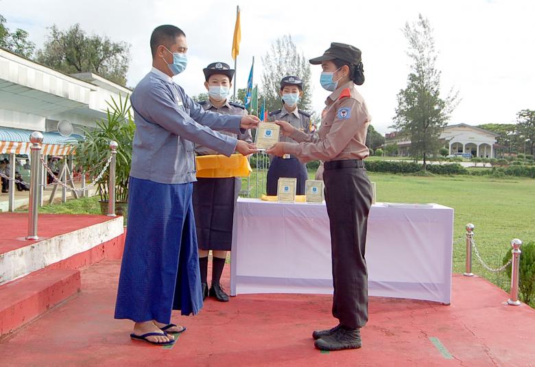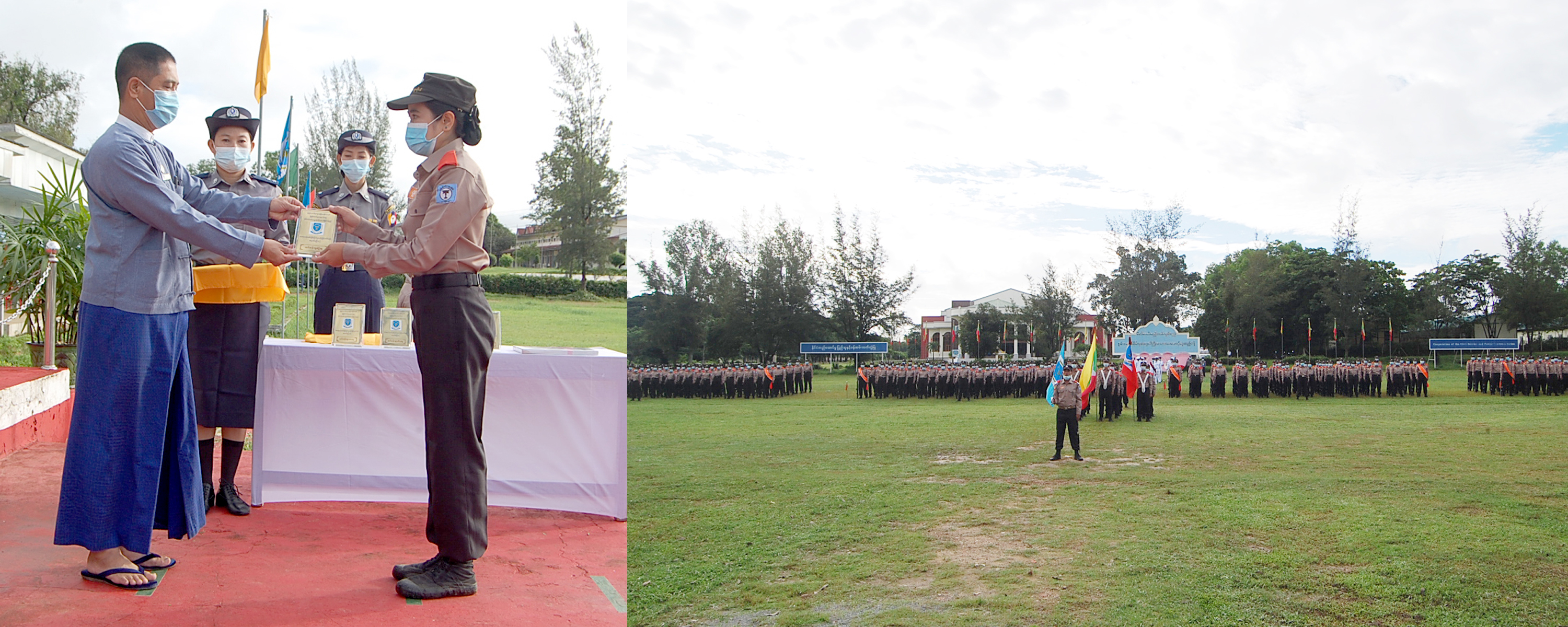 ယင်းနောက် ပါမောက္ခချုပ်က သင်တန်းသားစံပြဆုကို သင်တန်းသား ဦးဇာဏီဖြိုး၊ ဌာနခွဲစာရေး၊ နိုင်ငံခြားရေးဝန်ကြီးဌာနကို လည်းကောင်း၊ သင်တန်းသူစံပြဆုကို သင်တန်းသူ ဒေါ်အိအိဖြိုး၊ ဌာနခွဲစာရေး၊ အထွေထွေအုပ်ချုပ်ရေးဦးစီးဌာန၊ ပြည်ထဲရေးဝန်ကြီးဌာနကို လည်းကောင်း ချီးမြှင့်ပြီး သင်တန်းသား/ သင်တန်းသူ ပထမဆု၊ ဒုတိယဆု၊ သေနတ်ပစ် ထူးချွန်ဆု၊ စစ်ရေးပြ ထူးချွန်ဆု ရရှိသူများနှင့် သင်တန်းဆင်းအောင်လက်မှတ်များကို ဆက်လက်ချီးမြှင့်ခဲ့ပြီး သင်တန်းဆင်း အမှာစကား ပြောကြားသည်။