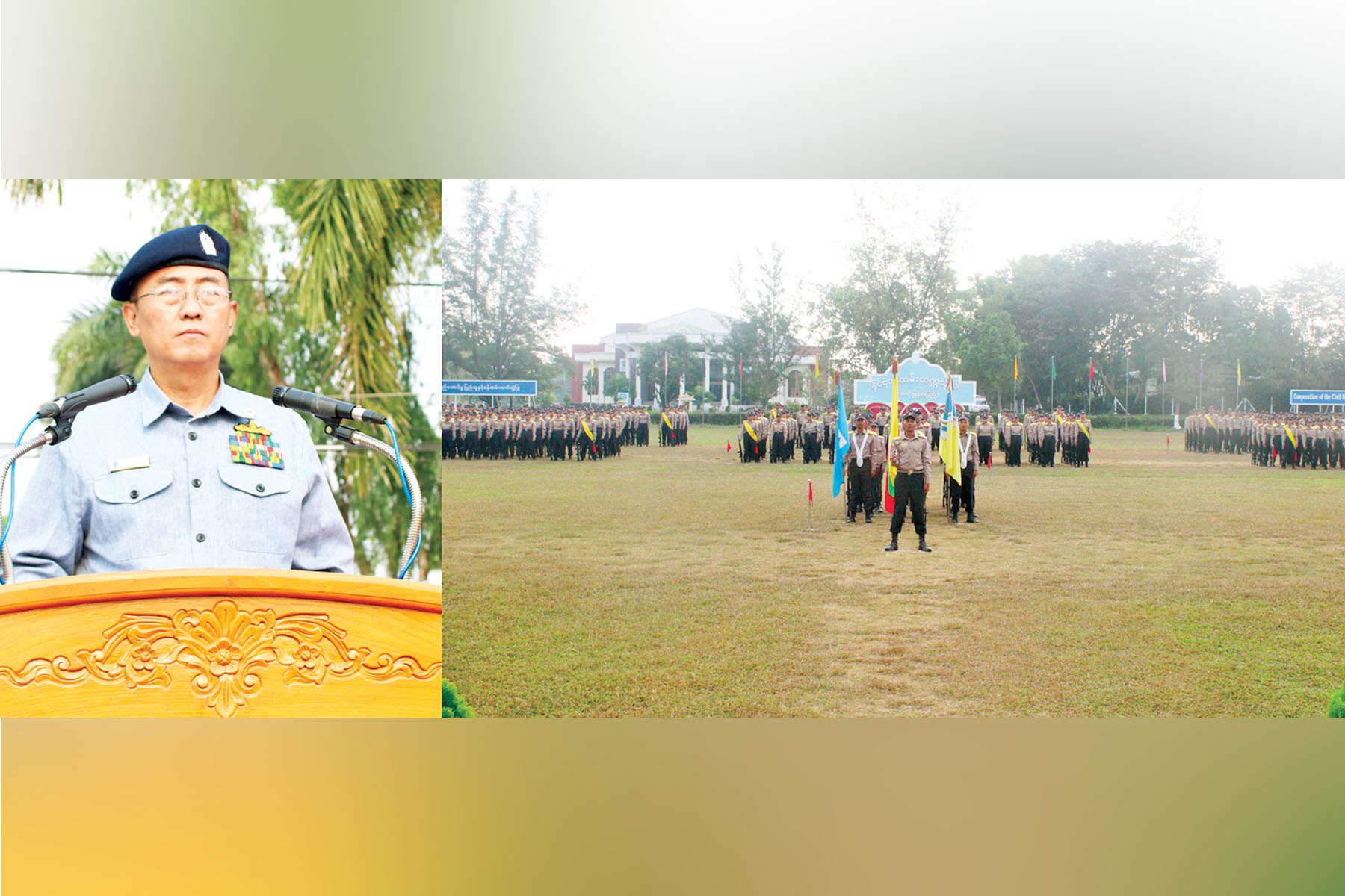 ဦးစွာ သင်တန်းဆင်းတပ်ခွဲက ပါမောက္ခချုပ်ကို အလေးပြုပြီး နိုင်ငံတော်အလံအား အလေးပြု ကြသည်။