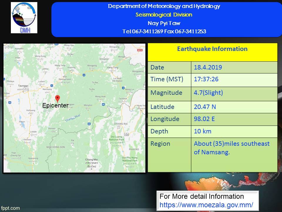 ယနေ့ ညနေ ၅ နာရီ ၃၇ မိနစ်တွင် နမ့်စန်မြို့၏ အရှေ့တောင်ဘက် (၃၅)မိုင်ခန့်အကွာကို ဗဟိုပြုပြီး အင်အားရစ်(ခ်)တာစကေး (၄ ဒသမ ၇) အဆင့်ရှိ အင်အားအနည်းငယ်ရှိ မြေငလျင်တစ်ခု လှုပ်ရှားသွားကြောင်း မိုးလေဝသနှင့် ဇလဗေဒညွှန်ကြားမှုဦးစီးဌာနမှ ထုတ်ပြန်သည်။