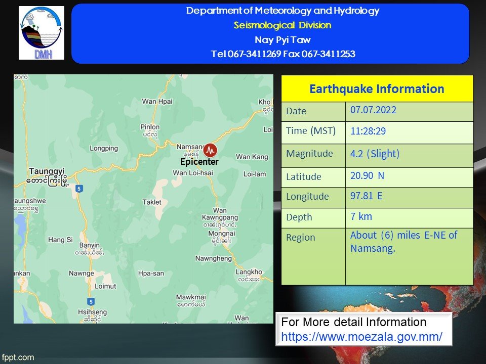 ၂၀၂၂ ခုနှစ်၊ ဇူလိုင်လ (၇)ရက်နေ့၊ မြန်မာစံတော်ချိန် (၁၁)နာရီ၊ (၂၈)မိနစ်၊ (၂၉) စက္ကန့်အချိန်တွင် ‌တောင်ကြီးမြေငလျင်စခန်းမှ အရှေ့-အရှေ့မြောက်ဘက် (၅၂) မိုင်ခန့်ကွာဝေးသော မြန်မာနိုင်ငံ ပြည်တွင်း (နမ့်စန်မြို့၏ အ‌ရှေ့-အရှေ့မြောက်ဘက် (၆)မိုင် ခန့်အကွာ) မြောက်လတ္တီတွဒ် (၂၀.၉၀) ဒီဂရီ၊ အရှေ့လောင်ဂျီတွဒ် (၉၇.၈၁)ဒီဂရီ၊ အနက် (၇)ကီလိုမီတာကို ဗဟိုပြု၍ အင်အားရစ်(ခ်)တာစကေး (၄.၂) အဆင့်ရှိ အင်အားအနည်းငယ်ရှိသော မြေငလျင်တစ်ခု လှုပ်ရှားသွားကြောင်း တိုင်းထွာရရှိပါသည်။