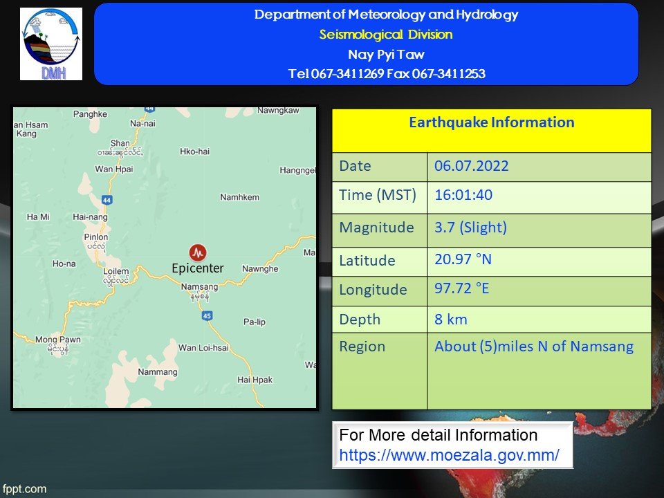 ၂၀၂၂ ခုနှစ်၊ ဇူလိုင်လ (၆)ရက်နေ့၊ မြန်မာစံတော်ချိန် (၁၆)နာရီ၊ (၀၁)မိနစ်၊ (၄၀)စက္ကန့် အချိန်တွင် နမ့်စန်မြေငလျင်စခန်းမှ မြောက်-အနောက်မြောက်ဘက် (၆)မိုင်ခန့်ကွာဝေးသော မြန်မာနိုင်ငံပြည်တွင်း (နမ့်စန်မြို့၏ မြောက်ဘက် (၅)မိုင်ခန့်အကွာ)၊ မြောက်လတ္တီတွဒ် (၂၀.၉၇)ဒီဂရီ၊ အရှေ့လောင်ဂျီတွဒ် (၉၇.၇၂)ဒီဂရီ၊ အနက် (၈)ကီလိုမီတာကို ဗဟိုပြု၍ အင်အား ရစ်(ခ်)တာစကေး (၃.၇)အဆင့်ရှိ အင်အားအနည်းငယ်ရှိသော မြေငလျင်တစ်ခု လှုပ်ရှားသွားကြောင်း တိုင်းထွာရရှိပါသည်။