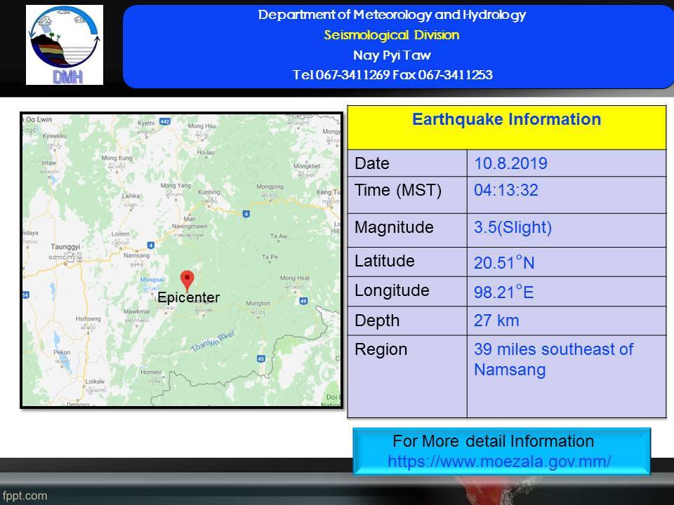 သြဂုတ် ၁၀ ရက် မြန်မာစံတော်ချိန် နံနက် ၄ နာရီ ၁၃ မိနစ်တွင် နမ့်စန်မြေငလျင်စခန်းမှ အရှေ့တောင်ဘက် (၃၉) မိုင်ခန့်အကွာတွင် မြေငလျင် တစ်ခုလှုပ်ရှားသွားကြောင်း သိရသည်။