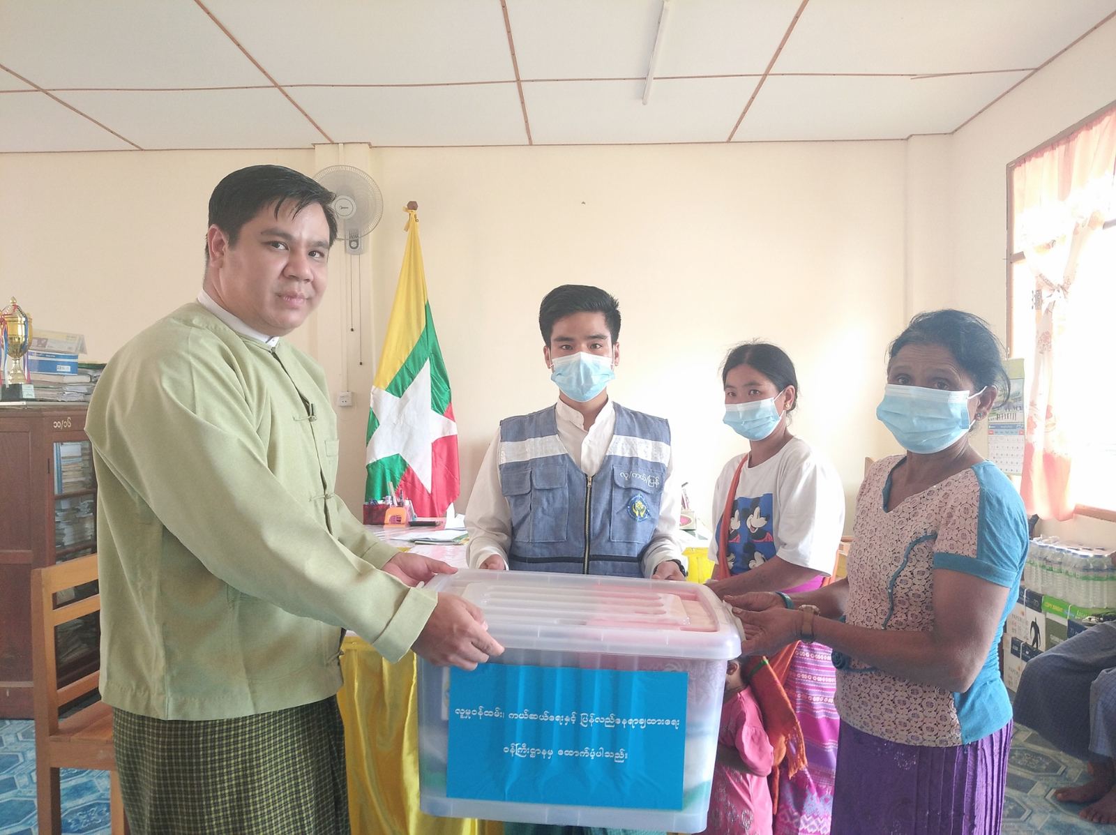 ထိုသို့ထောက်ပံ့ပေးအပ်ရာတွင် မြို့နယ်စီမံအုပ်ချုပ်ရေးအဖွဲ့ဥက္ကဋ္ဌ ဦးဝင်းမင်းထွန်း၊ မြို့နယ် ဘေးအန္တရာယ် ဆိုင်ရာစီမံခန့်ခွဲမှုဦးစီးဌာနမှ ဒုတိယဦးစီးမှူး ဦးသိန်းဟန်နှင့် တာဝန်ရှိသူများက လေပြင်းတိုက်ခတ်ပြီး မိုးသည်းထန်စွာ ရွာသွန်းမှုကြောင့် ပျက်စီးခဲ့သည့် ခိုမိုကျေးရွာအုပ်စု၊ အိုလဘန်ဒါကုန်းရှိ လူနေအိမ် ၁ လုံး၊ ဆိုက်ခေါင်ကျေးရွာအုပ်စု၊ နမ့်ကန်ကျေးရွာရှိ လူနေအိမ် ၁ လုံး၊ စုစုပေါင်း လူနေအိမ် ၂ လုံးအတွက် ကယ်ဆယ်ရေးပစ္စည်း (၁၇)မျိုးပါ ပလပ်စတစ်ပုံး ၂ ပုံး၊ အိမ်ဆောက်ပစ္စည်းဖိုး ငွေကျပ် ၄၀၀၀၀၀ ကျပ်၊ လူဦးရေ ၁၀ ဦးတို့အတွက် တစ်ပတ်စာ ဆန်ရိက္ခာဖိုး ငွေကျပ် ၂၁၀၀၀ ကျပ်တို့အား ထောက်ပံ့ ပေးအပ်ခဲ့ ကြောင်း မြို့နယ်စီမံအုပ်ချုပ်ရေးအဖွဲ့ဥက္ကဋ္ဌ ဦးဝင်းမင်းထွန်းထံက သိရသည်။