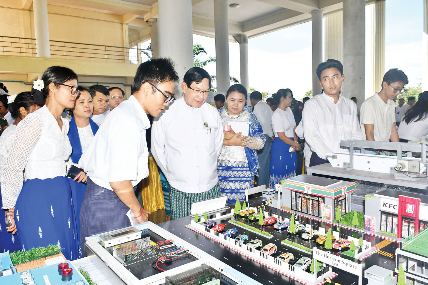 ယင်းနောက် နည်းပညာတက္ကသိုလ်(မှော်ဘီ) ပါမောက္ခချုပ် ဒေါက်တာကေသီလွင်က ပြပွဲ၊ ပြိုင်ပွဲများ အကြောင်းကို ရှင်းလင်းတင်ပြပြီး တိုင်းဒေသကြီးဝန်ကြီးချုပ်နှင့်အဖွဲ့က ကျောင်းသား ကျောင်းသူများ ၏ Project များအား လှည့်လည်ကြည့်ရှု အားပေးသည်။