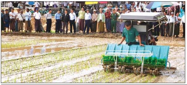 ဦးစွာ တိုင်းဒေသကြီးဝန်ကြီးချုပ်သည် ဒိုက်ဦးမြို့နယ် ပေါက်တပင်ကျေးရွာအုပ်စု၌ ဒေသင်္ခမိုးစပါးစိုက် တောင်သူများနှင့်တွေ့ဆုံ၍ စိုက်ပျိုးသီးနှံအလိုက် ပန်းတိုင်အထွက် နှုန်းတိုးတက်ရရှိရေးအတွက် မျိုး၊ မြေ၊ ရေ၊ နည်း ကောင်းမွန်ပြည့်စုံစေရေးနှင့် မိရိုးဖလာလက်မှု လယ်ယာစနစ်မှ စက်မှုလယ်ယာစနစ်သို့ မဖြစ်မနေ ပြောင်းလဲဆောင်ရွက်သွားနိုင်ရေး အကျယ်တဝင့် ရှင်းလင်းပြောကြားပြီး မိုးစပါးစိုက် တောင်သူများအား သွင်းအားစုများ ချီးမြှင့်ပေးအပ်သည်။ ထို့နောက် တိုင်းဒေသကြီး ဝန်ကြီးချုပ်သည် ဦးလွင်ဦး၏ လယ်မြေ ၁၀ ဧကအတွင်း ပဲခူးမြို့ Agro Future Myanmar Co., Ltd. မှ တီထွင်ထုတ်လုပ်ထားသော လူလိုက်ပါ စီးနင်းနိုင်သည့် ကောက်စိုက်စက်ဖြင့် မိုးစပါး စိုက်ပျိုးခြင်း ကွင်းသရုပ်ပြပွဲကို ကွင်းဆင်းကြည့်ရှု အားပေးသည်။ (အောက်ဝဲပုံ)