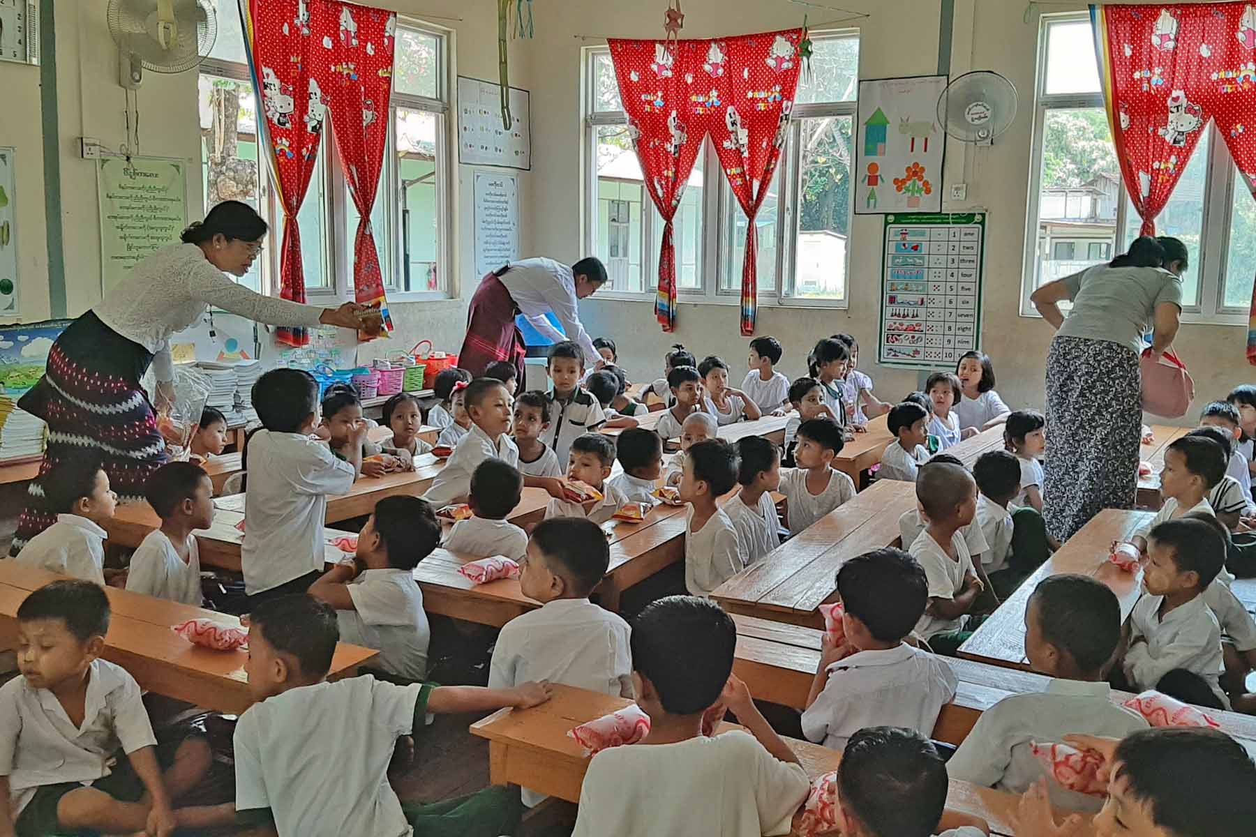 ထို့နောက် မြို့နယ်မွေးမြူရေးနှင့်ကုသရေးဦးစီးဌာန မြို့နယ်ဦးစီးမှူး ဒေါက်တာမြင့်ဌေးနိုင်၊ စည်ပင်ကော်မတီဥက္ကဋ္ဌ ဦးအောင်မျိုးဝင်း၊ စားသုံးသူရေးရာဦးစီးဌာန မြို့နယ်ဦးစီးမှူး ဦးအောင်လွင်၊ သမဝါယမဦးစီးဌာန မြို့နယ်ဦးစီးမှူး ဒေါ်ခင်မာအေး၊ လယ်ယာမြေစီမံခန့်ခွဲရေးနှင့် စာရင်းအင်းဦးစီးဌာန မြို့နယ် ဦးစီးမှူး ဦးကျော်လွင်၊ အခွန်ဦးစီးဌာန မြို့နယ်ဦးစီးမှူး ဦးသိန်းဝင်းနိုင်နှင့် ကျေးလက်ဒေသဖွံ့ဖြိုးတိုးတက် ရေးဦးစီးဌာန မြို့နယ်ဦးစီးမှူး ဦးထက်အောင်တို့သည် ကျောင်းသား၊ ကျောင်းသူ ၁၇၀ဝ အား နွားနို့နှင့် ပေါင်မုန့်များကို တိုက်ကျွေးခဲ့ကြသည်။