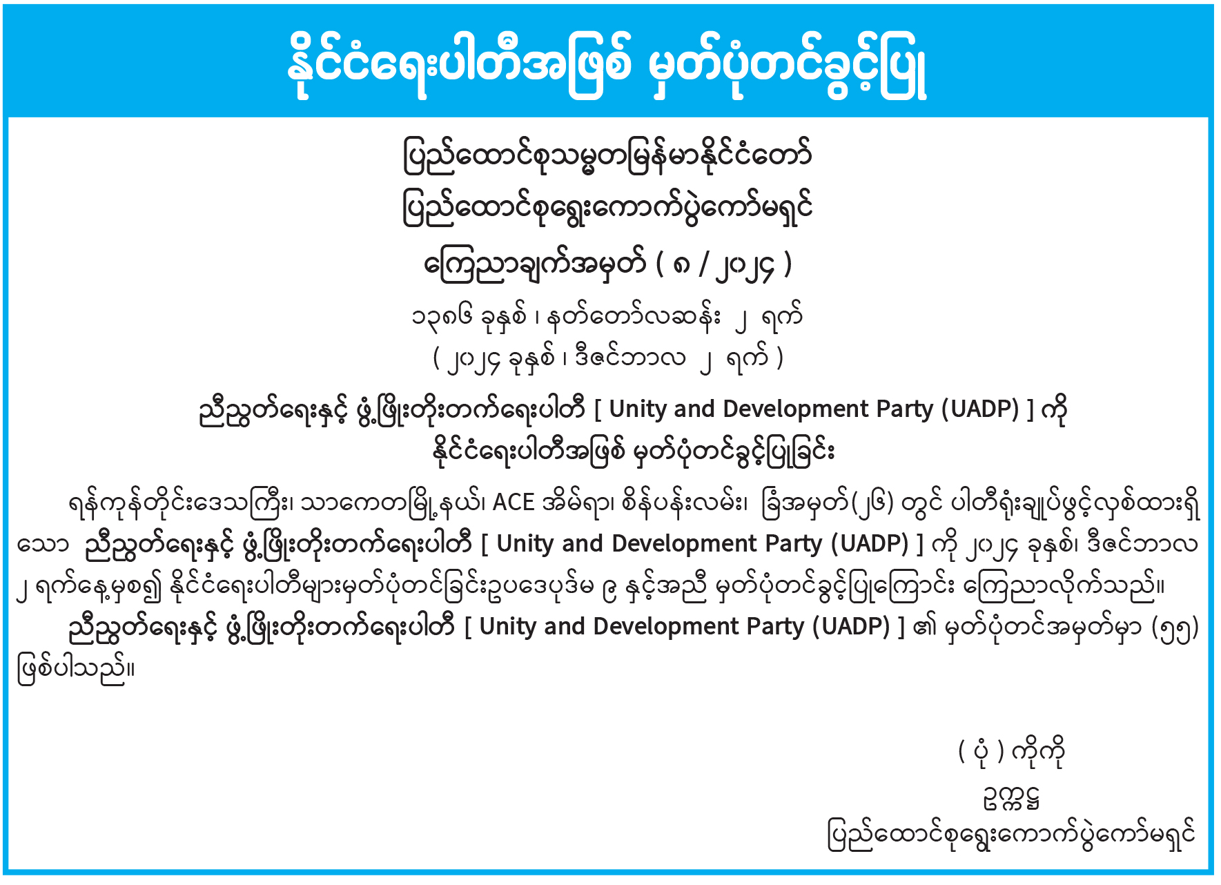ညီညွတ်ရေးနှင့် ဖွံ့ဖြိုးတိုးတက်ရေးပါတီ [ Unity and Development Party (UADP) ] ကို နိုင်ငံရေးပါတီအဖြစ် မှတ်ပုံတင်ခွင့်ပြု
