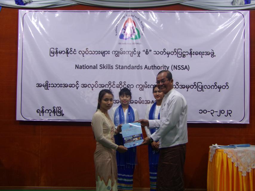 အခမ်းအနားတွင် မြန်မာနိုင်ငံ လုပ်သားများကျွမ်းကျင်မှု “စံ” သတ်မှတ်ပြဋ္ဌာန်း ရေးအဖွဲ့ (NSSA) ဥက္ကဌ၊ အလုပ်သမားဝန်ကြီးဌာန ဒုတိယဝန်ကြီး ဦးဝင်းရှိန်က NSSA အနေဖြင့် ၂၀၁၄ ခုနှစ် ကစတင်ပြီး အလုပ်အကိုင်အလိုက် ကျွမ်းကျင်လုပ်သားများကို စစ်ဆေးအကဲဖြတ်၍ အမျိုးသားအဆင့် အလုပ်အကိုင်ဆိုင်ရာ ကျွမ်းကျင်မှုအသိအမှတ်ပြု လက်မှတ်များ ထုတ်ပေးလျက်ရှိကြောင်း၊ လက်ရှိအချိန်ထိ အလုပ်အကိုင် (၃၅) မျိုးအတွက် ကျွမ်းကျင်လုပ်သား ၂၁,၈၆၁ ဦးကို အသိအမှတ် ပြုပေးနိုင်ခဲ့ပြီး ၁၈,၁၇၀ ကို ကျွမ်းကျင်မှု အဆင့်အလိုက် အသိအမှတ်ပြုလက်မှတ်များ ထုတ်ပေးပြီးဖြစ်ကြောင်း။