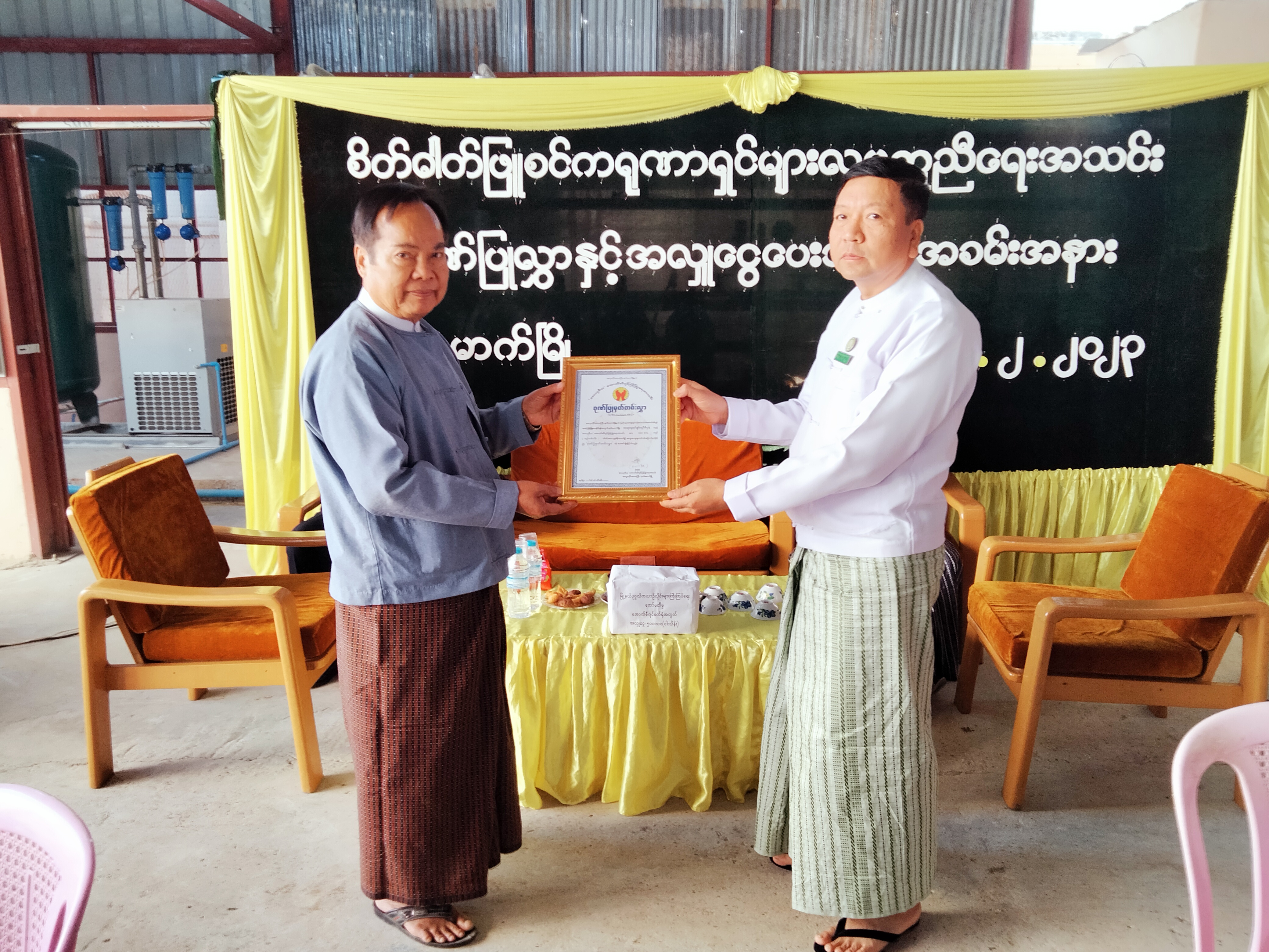 အခမ်အနားတွင် နတ်မောက်မြို့ စိတ်ဓာတ်ဖြူစင် ကရုဏာရှင်များ လူမှုကူညီရေးအသင်းဥက္ကဋ္ဌ ဦးဉာဏ်ရှိန်က အာယုဒီယ အောက်ဆီဂျင်စက်ရုံလုပ်ငန်း ဆောင်ရွက်နေသည့် အခြေအနေများအား ရှင်းလင်းပြောကြားပြီး မြို့နယ်ဌာနဆိုင်ရာများမှ အောက်ဆီဂျင်စက်ရုံအတွက် လှူဒါန်းသည့်အလှူငွေ ဂုဏ်ပြုမှတ်တမ်းလွှာများကို မြို့နယ်အုပ်ချုပ်ရေးမှူး ဦးသန့်စင်အား ပေးအပ်ခဲ့သည်။ ဆက်လက်၍ မြို့နယ်ပုဂ္ဂလိကလုပ်ငန်းသုံး မော်တော်ယာဉ်များ ကြီးကြပ်ရေးကော်မတီမှ အောက်ဆီဂျင်စက်ရုံအတွက် လှူဒါန်းသည့် အလှူငွေအား စိတ်ဓာတ်ဖြူစင် ကရုဏာရှင်များ လူမှုကူညီရေးအသင်း ဥက္ကဋ္ဌထံသို့လည်းကောင်း၊ မြို့ပေါ်(၇)ရပ်ကွက်မှ အောက်ဆီဂျင်စက်ရုံအတွက် လှူဒါန်းသည့် အလှူငွေဂုဏ်ပြုမှတ်တမ်းများအား မြို့ပေါ်(၇)ရပ်ကွက်ကိုယ်စား အောင်ဆန်းရပ်ကွက်အုပ်ချုပ်ရေးမှူးအား လည်းကောင်း ပေးအပ်ခဲ့ကြပြီး စိတ်ဓာတ်ဖြူစင်ကရုဏာရှင်များ လူမှုကူညီရေးအသင်းဥက္ကဋ္ဌမှ (၂၀၂၀/၂၀၂၁) ကိုဗစ်-၁၉ ကာကွယ်ထိန်းချုပ်ကုသရေးလုပ်ငန်းများ၌ စွမ်းစွမ်းတမံ ကူညီဆောင်ရွက်ပေးခဲ့သူများအား ဂုဏ်ပြုမှတ်တမ်းလွှာများကို ပေးအပ်ခဲ့ကြကြောင်း သိရသည်။
