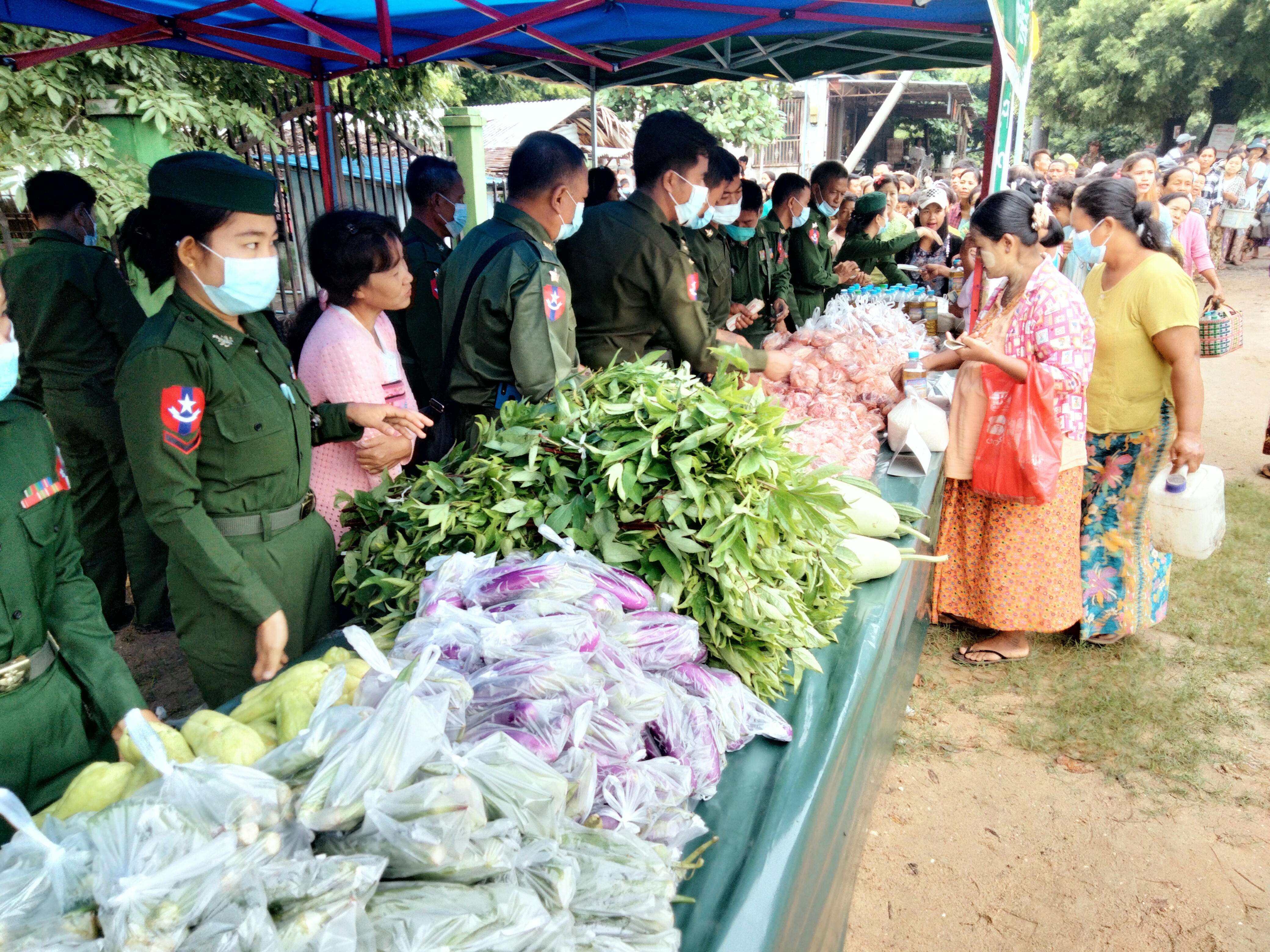 အလယ်ပိုင်းတိုင်းစစ်ဌာနချုပ်၏ စီစဉ်ဆောင်ရွက်မှုဖြင့် အခြေခံစားသောက်ကုန်နှင့် အသား၊ ငါး၊ ဟင်းသီး ဟင်းရွက်များကို စျေးနှုန်းသက်သာစွာဖြင့် ရောင်းချပေးရာတွင် ဆန်(၁)ပြည် ၁၂၅၀ ကျပ်၊ ဆီ(၅၀)ကျပ်သား ၂၇၀၀ ကျပ်၊ ကြက်ဥ(၅)လုံး ၉၀၀ ကျပ်၊ ကြက်သား(၁)ပိဿာ ၇၂၀၀ ကျပ်၊ အမဲသား(၁)ပိဿာ ၁၀၀၀၀ ကျပ်နှင့် ဟင်းသီးဟင်းရွက် အမျိုးစုံကို သက်သာသောစျေးနှုန်းဖြင့် ရောင်းချပေးခဲ့ကြောင်း သိရသည်။