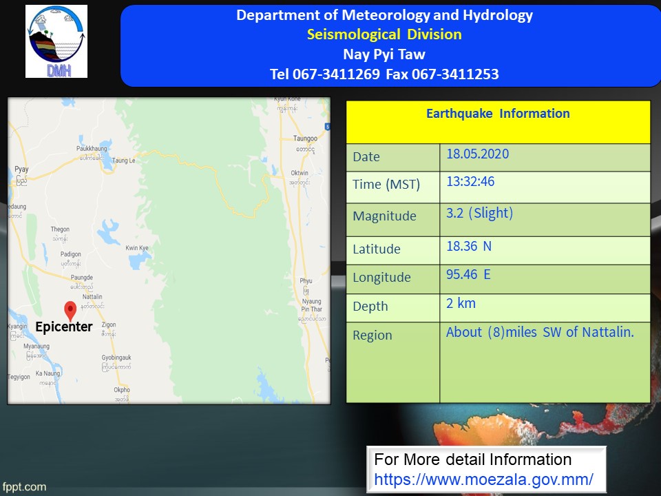 ၂၀၂၀ ပြည့်နှစ်၊ မေလ (၁၈) ရက်နေ့၊ မြန်မာစံတော်ချိန် (၁၃) နာရီ၊ (၃၂) မိနစ်၊ (၄၆) စက္ကန့် အချိန်တွင် တောင်ငူမြေငလျင်စခန်းမှ အနောက်တောင်ဘက်(၇၅)မိုင်ခန့်ကွာဝေးသော မြန်မာ နိုင်ငံပြည်တွင်း (နတ်တလင်းမြို့၏ အနောက်တောင်ဘက် (၈) မိုင်ခန့်အကွာ)၊ မြောက်လတ္တီတွဒ် (၁၈.၃၆)ဒီဂရီ၊ အရှေ့လောင်ဂျီတွဒ်(၉၅.၄၆)ဒီဂရီ၊ အနက်(၂)ကီလိုမီတာကို ဗဟိုပြု၍ အင်အား ရစ်(ခ်)တာစကေး(၃ . ၂)အဆင့်ရှိ အင်အားအနည်းငယ်ရှိသော မြေငလျင်တစ်ခု လှုပ်ရှားသွားကြောင်း တိုင်းထွာရရှိပါသည်။