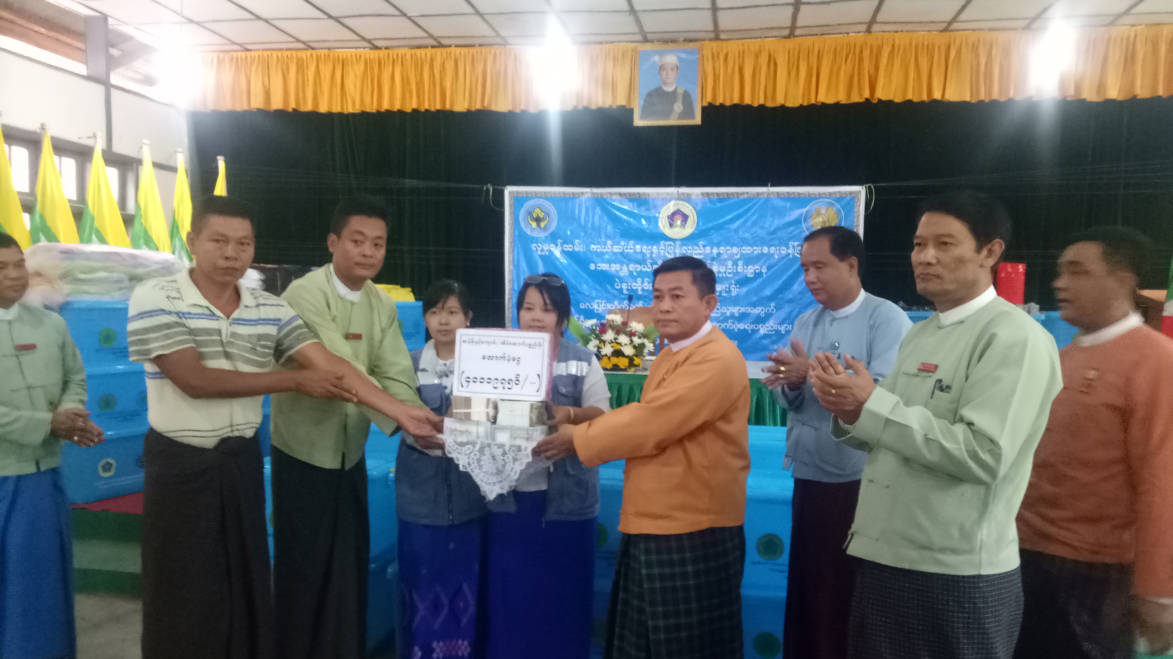 မေလ ၁၅၊ ၁၆၊ ၁၉၊ ၂၀ နှင့် ၂၁ ရက်က တိုက်ခတ်ခဲ့သော လေပြင်းဒဏ်ခံစားခဲ့ရသည့် ရပ်ကွက်/ကျေးရွာ ၆၄ ခုမှ ပြည်သူများအတွက် အိမ်ဆောက်ပစ္စည်း၊ ရိက္ခာ၊ ဆန်ဖိုးနှင့် ထောက်ပံ့ရေး ပစ္စည်းများကို ဝန်ကြီးချုပ်နှင့် သာယာဝတီခရိုင် အုပ်ချုပ်ရေးမှူးတို့က ပေးအပ်ခဲ့ရာ မြို့နယ်အုပ်ချုပ်ရေး မှူးက လက်ခံရယူခဲ့သည်။