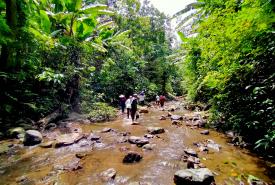 အဆိုပါ ရေတံခွန်ကြီးဆီသို့ စတင်ကာ တောအတွင်းဝင်သွားရန် မိုင်းလွေကျေးရွာသို့ အဖွဲ့လိုက်စတင် ရောက်ခဲ့ချိန်မှာတော့ ယင်းကျေးရွာရှိ ကျောင်းဆရာတစ်ဦး အိမ်တွင် အဖွဲ့များပြန်စုပြီး ဆက်လက် ထွက်ခွာမည်အပြုမှာတော့ ရေတံခွန်ကြီးသို့ သွားမည့်လမ်းကို အဖွဲ့ထဲမှ မည်သူတစ်ဦး တစ်ယောက်မျှ မသိကြပေ။ ဒီလိုနဲ့ ကျောင်းဆရာ၏ ဇနီးမှ ရေတံခွန်သို့ သွားရာလမ်းအစကို လိုက်ပြပေး၍ စာရေးသူတို့အဖွဲ့မှာ ရေတံခွန်ကြီး ရှိရာလမ်းကို ဆိုင်ကယ်များနှင့် ထွက်လာပါတော့သည်။ မိုင်းလွေကျေးရွာ၏ အနောက်ဘက်ဘေး မြေသားလမ်းမအတိုင်း စတင်ထွက်ခွာလာခဲ့ရာ မိနစ်နှစ်ဆယ့်ခန့် အချိန်တွင် ဆိုင်ကယ်များ သွားလာ၍ မရတော့သဖြင့် အဖွဲ့သားအားလုံးဆင်းကာ မိမိတို့ ဆိုင်ကယ်များ ကိုယ်စီဇက်တော့ပ်ခပ်ပြီး ခြေလျင်ခရီး စတင်ပါတော့သည်။