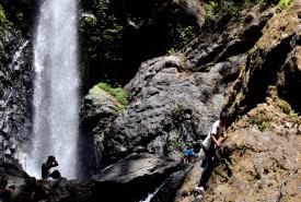 စာရေးသူမှာ ရောက်ချင်ခဲ့သည့် မိုင်းလွေရေတံခွန်ကြီးကို တွေ့ကာ အမောအပန်းများ ပြေပျောက်လျက် လမ်းတစ်ဝက်ကျော်တွင် ကျန်ခဲ့ကြသည့် အဖွဲ့သားများကို ပြန်လှည့်ခေါ်ကာ အဖွဲ့အစုံ လိုက် ကျောက်ဆောင်ကျောက်တုံးနှင့်တောင်စောင်းဘေးတို့မှ ခက်ခဲစွာသွားလျက် ပင်မရေတံခွန်ကြီးရှိရာသို့ ရောက်လာလေတော့သည်။