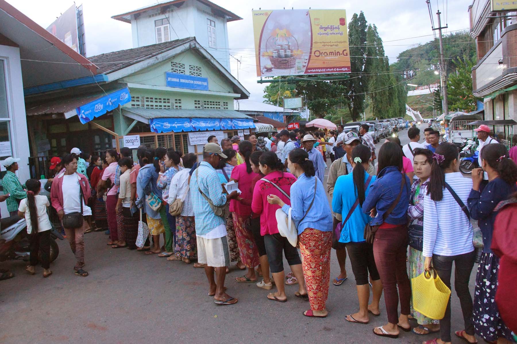 မြန်မာ့ရိုးရာ မဟာသင်္ကြန်ပွဲတော်ရက်များမတိုင်မီ ယခုရက်ပိုင်းအတွင်း ထိုင်း-မြန်မာ နယ်စပ်မြို့ဖြစ်သည့် ကော့သောင်းမြို့မှ ထိုင်းနိုင်ငံ ရနောင်းမြို့သို့ သွားရောက် လည်ပတ်ကြသူ များပြားသဖြင့် ကော့သောင်းမြို့ လူဝင်မှုကြီးကြပ်ရေး နယ်စပ်ဖြတ်သန်းဂိတ်တွင် သွားရောက်လည်ပတ်မည့်သူများ ယနေ့နံနက်ပိုင်းက နယ်စပ်ဖြတ်သန်းမှု အခွန်ဆောင်ရန် တန်းစီစောင့်ဆိုင်းနေသူများဖြင့် စည်ကားလျက်ရှိကြောင်း သိရသည်။