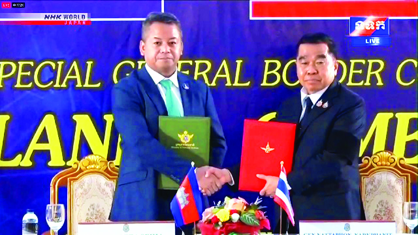 ထိုင်းနှင့် ကမ္ဘောဒီးယားနိုင်ငံတို့သည် သီတင်းပတ်များစွာ နယ်စပ်ပဋိပက္ခဖြစ်ပွားမှုများ အဆုံးသတ်ရေး ကြိုးပမ်းအားထုတ်မှုအနေဖြင့် အမြန်ဆုံးအပစ်အခတ်ရပ်စဲရေး သဘောတူညီချက်တစ်ရပ်ကို လက်မှတ်ရေးထိုးလိုက်ပြီဖြစ်ကြောင်း အင်န်အိတ်ချ်ကေ သတင်းတစ်ရပ်တွင် ဖော်ပြထားသည်။