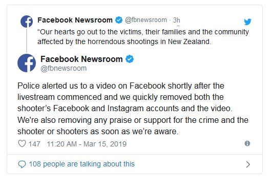 နယူးဇီလန် ရဲတပ်ဖွဲ့ဟာ အင်တာနက်ပေါ်မှာ တင်ထားတဲ့ ဗီဒီယိုဖိုင်ကို ဖြုတ်ချဖို့ လုပ်နေကြောင်း ပြောပါတယ်။ facebook က အဲဒီပစ်ခတ်မှုဗီဒီယိုကို ဖြုတ်ချပြီးကြောင်း နဲ့ အဲဒီပစ်ခတ်မှုကို ထောက်ခံတဲ့ စာမှန်သမျှကိုလည်း ဖျက်ပစ်ကြောင်း ပြောကြားပါတယ်။