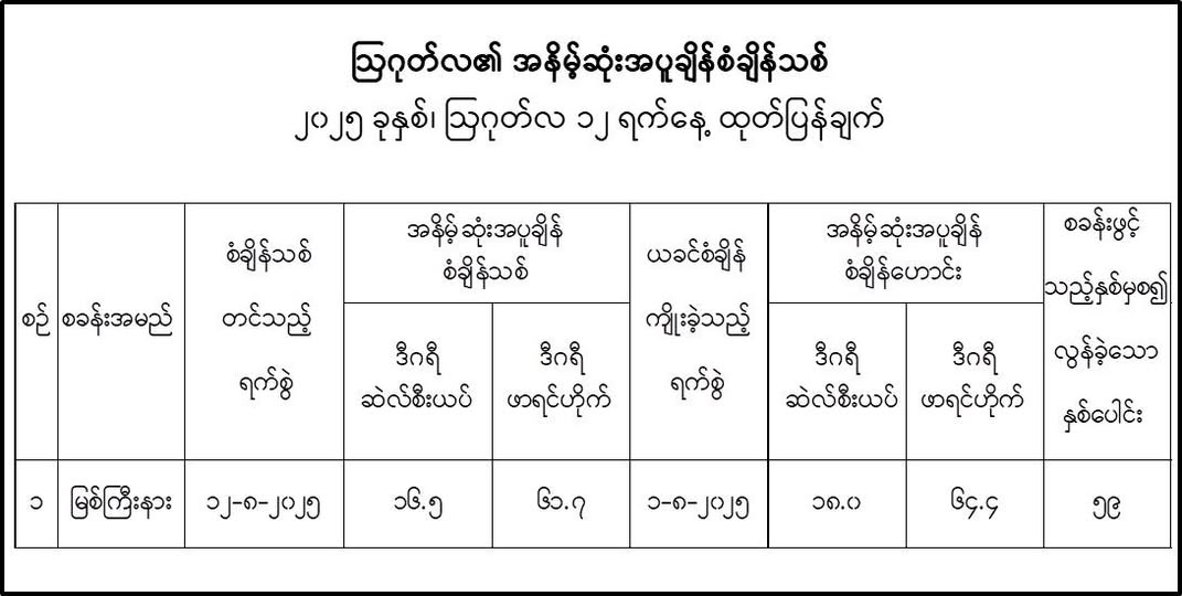 Aug 12,2025 |02:50 | ၁၂-၈-၂၀၂၅ ၂၀၂၅ ခုနှစ်၊ ဩဂုတ်လ ၁၂ ရက်နေ့ ထုတ်ပြန်သည့် ဩဂုတ်လ၏ အနိမ့်ဆုံးအပူချိန် စံချိန်သစ် Crd> မိုး/ဇလ