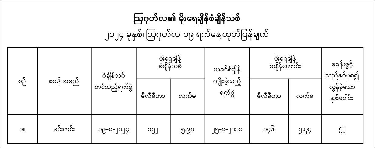 ၂၀၂၄ ခုနှစ်၊ ဩဂုတ်လ ၁၉ ရက်နေ့တွင် မိုးလေဝသနှင့် ဇလဗေဒညွှန်ကြားမှုဦးစီးဌာနမှ ထုတ်ပြန်သည့်၊ ဩဂုတ်လ၏ မိုးရေချိန်စံချိန်သစ်