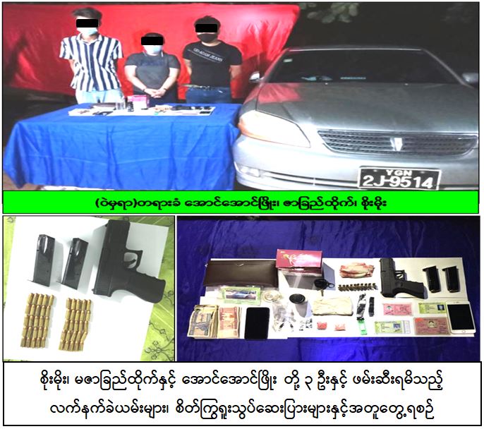 သိမ်းဆည်းရမိ လက်နက်ခဲယမ်းများကို သီပေါမြို့နေ စိစစ်ဆဲ ရှမ်းအမျိုးသား ၁ ဦးထံမှ လည်းကောင်း၊ မူးယစ်ဆေးဝါးများကို မရမ်းကုန်းမြို့နေ စိစစ်ဆဲ အမျိုးသား ၁ ဦးထံမှ လည်းကောင်း ဝယ်ယူခဲ့ခြင်းဖြစ်ကြောင်း ထွက်ဆိုသဖြင့် စိုးမိုး (၃၉) နှစ်၊ မဇာခြည်ထိုက် (၃၉) နှစ် နှင့် အောင်အောင်ဖြိုး (၂၄) နှစ် တို့ ၃ ဦးအား လက်နက်အက်ဥပဒေဖြင့်လည်းကောင်း၊ မူးယစ်ဆေးဝါးနှင့် စိတ်ကိုပြောင်းလဲစေသော ဆေးဝါးများဆိုင်ရာ ဥပဒေဖြင့်လည်းကောင်း အမှုဖွင့် အရေးယူထားရှိပြီး ကွင်းဆက်တရားခံများ ဖမ်းဆီးရမိရေး ဆက်လက်ဆောင်ရွက်လျက်ရှိကြောင်း မြန်မာနိုင်ငံရဲတပ်ဖွဲ့ထံမှ သတင်းရရှိသည်။