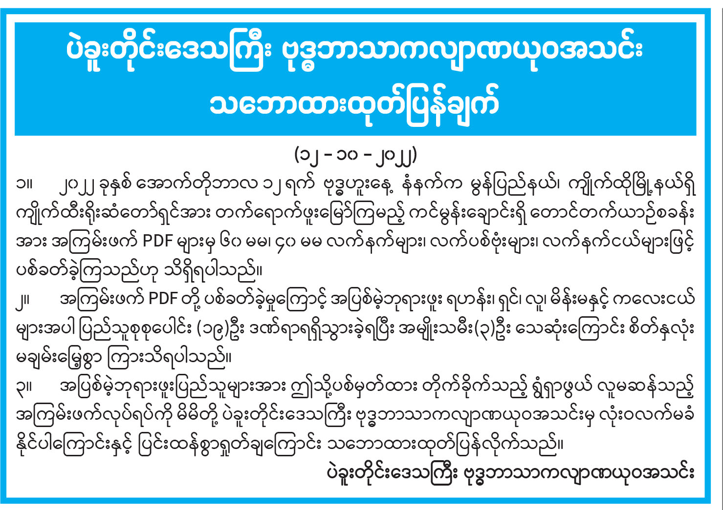 ၂။    အကြမ်းဖက် PDF တို့ ပစ်ခတ်ခဲ့မှုကြောင့် အပြစ်မဲ့ဘုရားဖူး ရဟန်း၊ ရှင်၊ လူ၊ မိန်းမနှင့် ကလေးငယ်များအပါ ပြည်သူစုစုပေါင်း (၁၉)ဦး ဒဏ်ရာရရှိသွားခဲ့ရပြီး အမျိုးသမီး(၃)ဦး သေဆုံးကြောင်း စိတ်နှလုံး မချမ်းမြေ့စွာ ကြားသိရပါသည်။