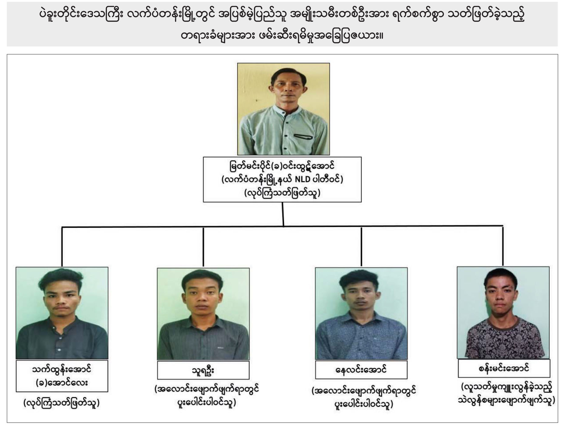 အကြမ်းဖက်အုပ်စုအဖြစ် ကြေညာထားသော CRPH ၊ NUG  နှင့်  ယင်းတို့၏ လက်အောက်ခံ PDF အမည်ခံအကြမ်းဖက် အဖွဲ့များ၊  ယင်းတို့နှင့် ဆက်နွှယ်နေသော အဖွဲ့အစည်းများနှင့် လူပုဂ္ဂိုလ်များ၊ အစွန်းရောက်  NLD ပါတီဝင်များသည်  နိုင်ငံတော် တည်ငြိမ်အေးချမ်းရေးကို ပျက်ပြားစေရန်နှင့်  ပြည်သူလူထုကို အကြောက်တရားများ  ဖြစ်ပေါ်စေပြီး အစိုးရယန္တရားများ ပျက်ပြားစေရန် ရည်ရွယ်လျက် နိုင်ငံ့ဝန်ထမ်းများ  အပါအဝင်  အပြစ်မဲ့ပြည်သူများကို  အဓိက ပစ်မှတ်ထား၍  လုပ်ကြံသတ်ဖြတ်ခြင်း၊  အများပြည်သူပိုင်  အဆောက်အဦများ မီးရှို့ခြင်း၊  ဖောက်ခွဲဖျက်ဆီးခြင်း  စသည့် အကြမ်းဖက်လုပ်ငန်းများကို  နည်းမျိုးစုံ ဖြင့် ပြုလုပ်လျက်ရှိသည်။
