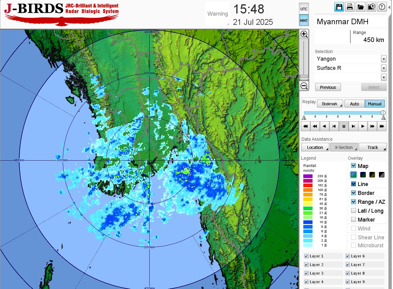 မိုးတိမ်တောင်ဖြစ်ပေါ်မှုအခြေအနေ။ ရန်ကုန်တိုင်းဒေသကြီး၊ စစ်ကိုင်းတိုင်းဒေသကြီးအထက်ပိုင်း၊ ဧရာဝတီတိုင်းဒေသကြီး၊ ကရင်ပြည်နယ်၊ မွန်ပြည်နယ်၊ ရခိုင်ပြည်နယ်နှင့် ရှမ်းပြည်နယ်(တောင်ပိုင်းနှင့် အရှေ့ပိုင်း)တို့တွင် မိုးတိမ်တောင်များ ဖြစ်ထွန်းလျက်ရှိပြီး၊ အဆိုပါ မိုးတိမ်တောင်များ ရွေ့လျားရာနေရာတစ်လျှောက်တွင် မိုးရွာသွန်းခြင်းနှင့်အတူ လေပြင်းတိုက်ခတ်ခြင်း၊ မိုးထစ်ချုန်းခြင်း၊ မိုးကြိုးပစ်ခြင်း၊ လျှပ်စီးလက်ခြင်းနှင့် မိုးသီးကြွေခြင်းစသည့် မိုးလေဝသဖြစ်စဉ်များ ဖြစ်ပေါ်နိုင်ပါသဖြင့် ကြိုတင်သတိပြုနိုင်ပါရန် အကြံပြုအပ်ပါသည်။