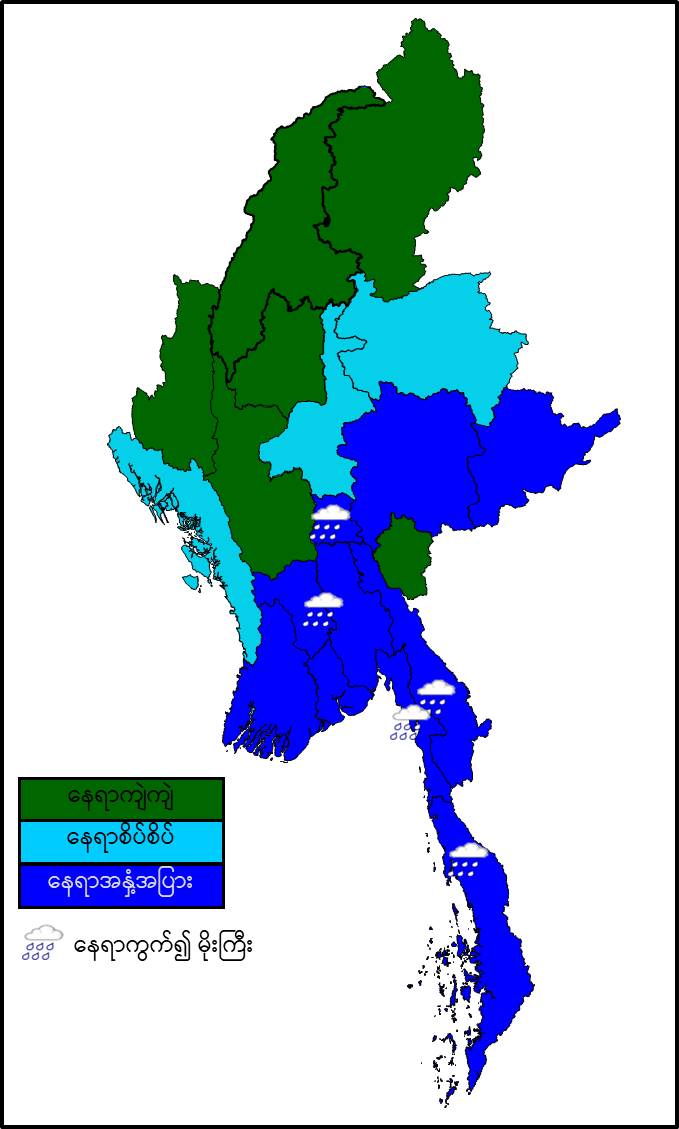 မနက်ဖြန်နံနက်အထိခန့်မှန်းချက်။ မကွေးတိုင်းဒေသကြီး၊ စစ်ကိုင်းတိုင်းဒေသကြီး၊ ကချင်ပြည်နယ်၊ ကယား ပြည်နယ်နှင့် ချင်းပြည်နယ်တို့တွင် နေရာကျဲကျဲ၊ မန္တလေးတိုင်းဒေသကြီး၊ ရခိုင်ပြည်နယ်နှင့် ရှမ်းပြည်နယ်(မြောက်ပိုင်း) တို့တွင် နေရာစိပ်စိပ်နှင့် ကျန်တိုင်းဒေသကြီးနှင့် ပြည်နယ်တို့တွင် နေရာအနှံ့အပြား မိုးထစ်ချုန်းရွာပြီး၊ နေပြည်တော်၊ ပဲခူးတိုင်းဒေသကြီး၊ တနင်္သာရီတိုင်းဒေသကြီး၊ ကရင်ပြည်နယ်နှင့် မွန်ပြည်နယ်တို့တွင် နေရာကွက်၍ မိုးကြီးနိုင်ပါသည်။ ရွာရန်ရာနှုန်းပြည့် ဖြစ်ပါသည်။