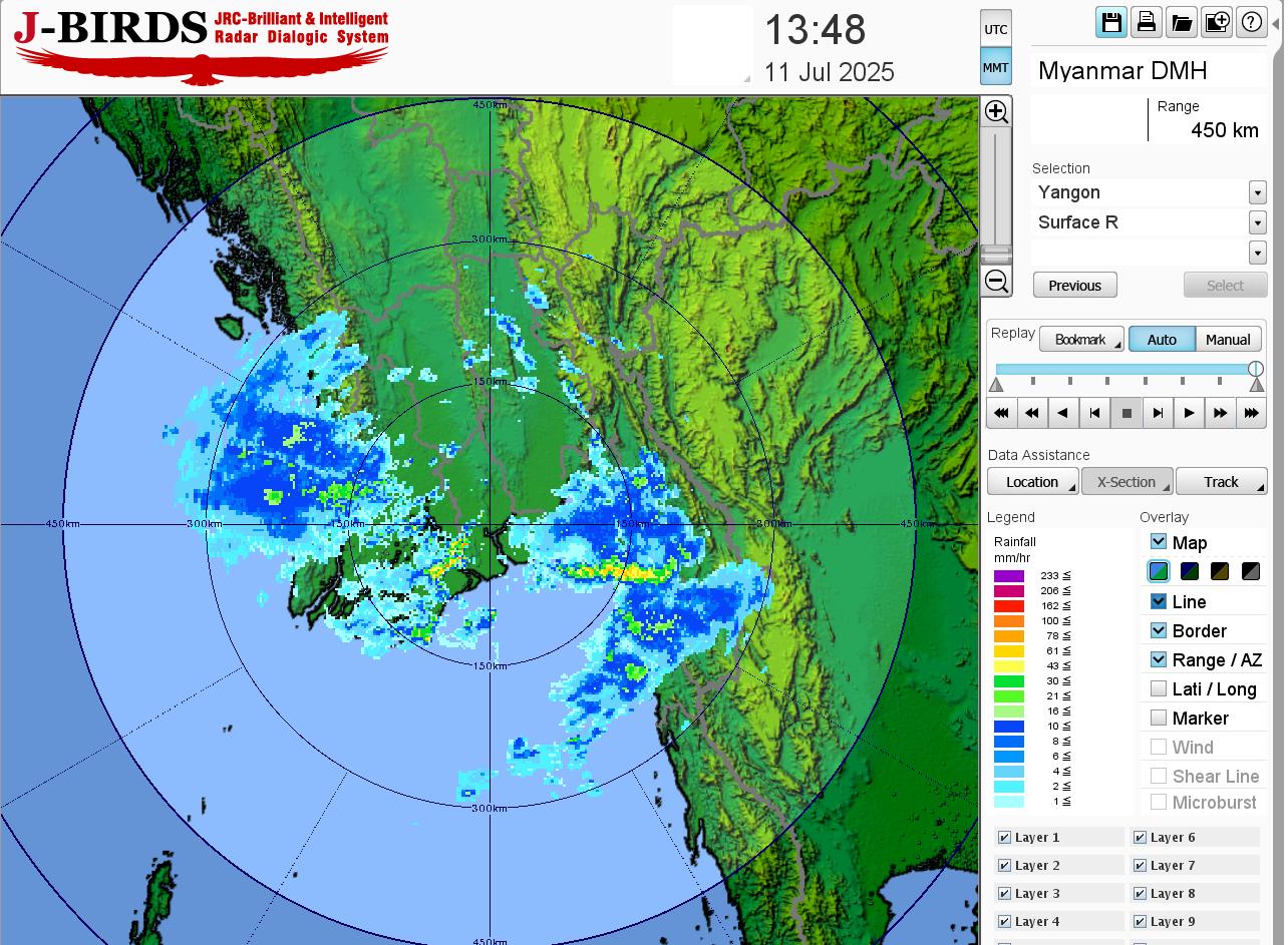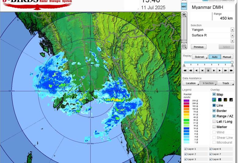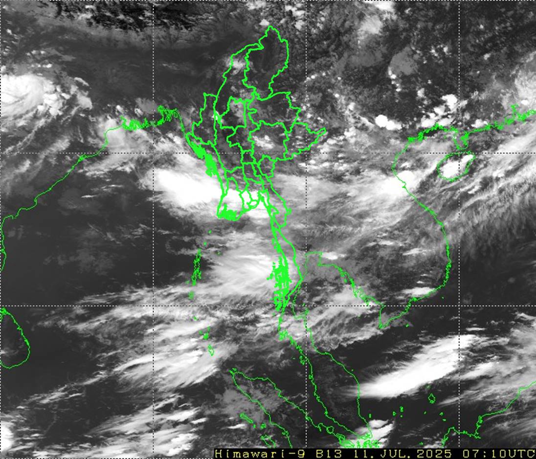 မိုးတိမ်တောင်ဖြစ်ပေါ်မှုအခြေအနေ။ ရန်ကုန်တိုင်းဒေသကြီး၊ ပဲခူးတိုင်းဒေသကြီး၊ ဧရာဝတီတိုင်းဒေသကြီး၊ တနင်္သာရီတိုင်းဒေသကြီး၊ မွန်ပြည်နယ်နှင့် ရခိုင်ပြည်နယ်တို့တွင် မိုးတိမ်တောင်များ ဖြစ်ထွန်းလျက်ရှိပြီး၊ အဆိုပါ မိုးတိမ်တောင်များ ရွေ့လျားရာနေရာ တစ်လျှောက်တွင် မိုးရွာသွန်းခြင်းနှင့်အတူ လေပြင်းတိုက်ခတ်ခြင်း၊ မိုးထစ်ချုန်းခြင်း၊ မိုးကြိုးပစ်ခြင်း၊ လျှပ်စီးလက်ခြင်းနှင့် မိုးသီးကြွေခြင်းစသည့် မိုးလေဝသဖြစ်စဉ်များ ဖြစ်ပေါ်နိုင်ပါသဖြင့် ကြိုတင်သတိပြုနိုင်ပါရန် အကြံပြုအပ်ပါသည်။