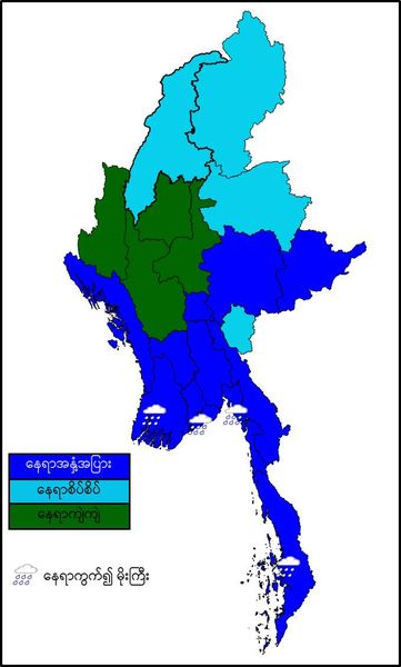 မနက်ဖြန်နံနက်အထိခန့်မှန်းချက်။ စစ်ကိုင်းတိုင်းဒေသကြီးအောက်ပိုင်း၊ မန္တလေးတိုင်းဒေသကြီး၊ မကွေးတိုင်းဒေသကြီးနှင့် ချင်းပြည်နယ်တို့တွင် နေရာကျဲကျဲ၊ စစ်ကိုင်းတိုင်းဒေသကြီးအထက်ပိုင်း၊ ကချင်ပြည်နယ်၊ ရှမ်းပြည်နယ်(မြောက်ပိုင်း)နှင့် ကယားပြည်နယ်တို့တွင် နေရာစိပ်စိပ်နှင့် ကျန်တိုင်းဒေသကြီးနှင့် ပြည်နယ်တို့တွင် နေရာအနှံ့အပြား မိုးထစ်ချုန်းရွာပြီး၊ ရန်ကုန်တိုင်းဒေသကြီး၊ ဧရာဝတီတိုင်းဒေသကြီး၊ တနင်္သာရီတိုင်းဒေသကြီးနှင့် မွန်ပြည်နယ်တို့တွင် နေရာကွက်၍ မိုးကြီးနိုင်ပါသည်။ ရွာရန်ရာနှုန်းပြည့် ဖြစ်ပါသည်။