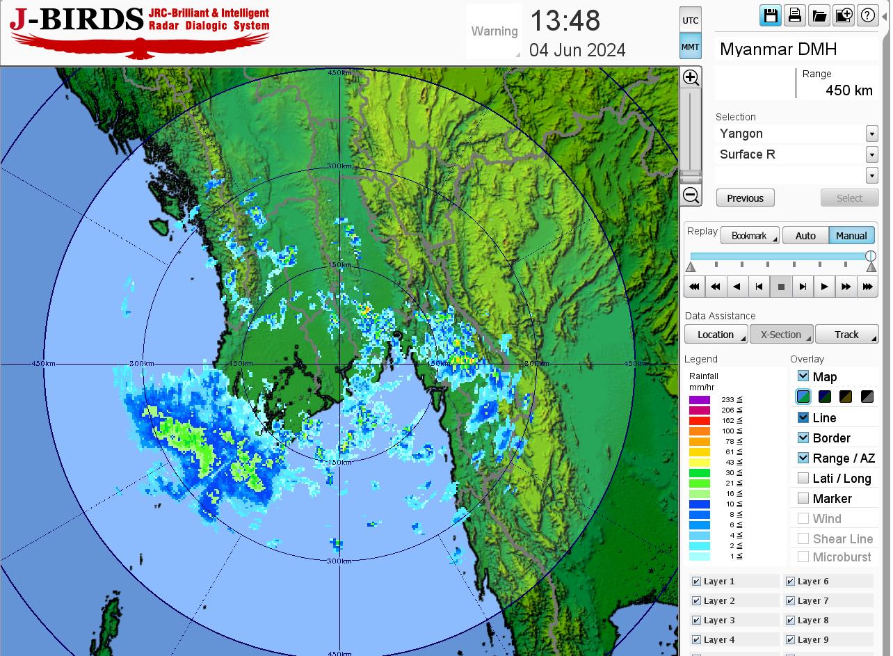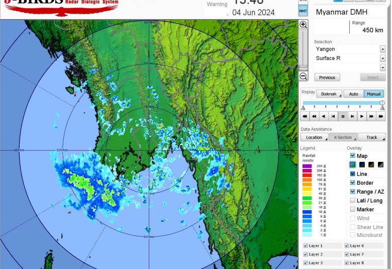မိုးတိမ်တောင်ဖြစ်ပေါ်မှုအခြေအနေ။ ရန်ကုန်တိုင်းဒေသကြီး၊ ဧရာဝတီတိုင်းဒေသကြီး၊ တနင်္သာရီတိုင်းဒေသကြီး၊ ရခိုင်ပြည်နယ်၊ ကရင်ပြည်နယ်နှင့် မွန်ပြည်နယ်တို့တွင် မိုးတိမ်တောင်များ ဖြစ်ထွန်းလျက်ရှိပါသည်။