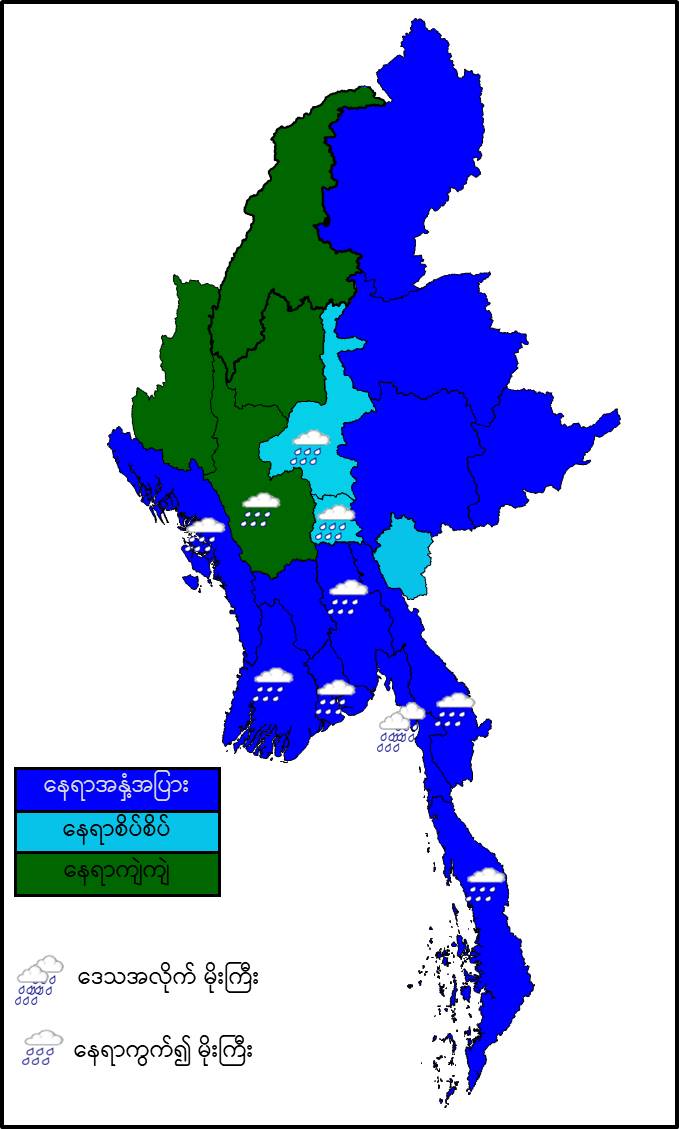 မနက်ဖြန်နံနက်အထိခန့်မှန်းချက်။ စစ်ကိုင်းတိုင်းဒေသကြီး၊ မကွေးတိုင်းဒေသကြီးနှင့် ချင်းပြည်နယ်တို့တွင် နေရာကျဲကျဲ၊ နေပြည်တော်၊ မန္တလေးတိုင်းဒေသကြီးနှင့် ကယားပြည်နယ်တို့တွင် နေရာစိပ်စိပ်နှင့် ကျန်တိုင်းဒေသကြီးနှင့် ပြည်နယ်တို့တွင် နေရာအနှံ့အပြား မိုးထစ်ချုန်းရွာပြီး၊ မွန်ပြည်နယ်တွင် ဒေသအလိုက်နှင့် နေပြည်တော်၊ မန္တလေးတိုင်းဒေသကြီး၊ မကွေးတိုင်းဒေသကြီး၊ ပဲခူးတိုင်းဒေသကြီး၊ ရန်ကုန်တိုင်းဒေသကြီး၊ ဧရာဝတီတိုင်းဒေသကြီး၊ တနင်္သာရီတိုင်းဒေသကြီး၊ ရခိုင်ပြည်နယ်နှင့် ကရင်ပြည်နယ်တို့တွင် နေရာကွက်၍ မိုးကြီးနိုင်ပါသည်။ ရွာရန်ရာနှုန်းပြည့် ဖြစ်ပါသည်။