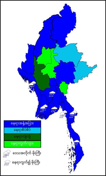 မနက်ဖြန်နံနက်အထိခန့်မှန်းချက်။ စစ်ကိုင်းတိုင်းဒေသကြီးအောက်ပိုင်း၊ မန္တလေးတိုင်းဒေသကြီး၊ မကွေးတိုင်းဒေသကြီးနှင့် ကယားပြည်နယ်တို့တွင် နေရာကျဲကျဲ၊ စစ်ကိုင်းတိုင်းဒေသကြီးအထက်ပိုင်း၊ ကချင်ပြည်နယ်၊ ရှမ်းပြည်နယ်(မြောက်ပိုင်း)နှင့် ချင်းပြည်နယ်တို့တွင် နေရာစိပ်စိပ်နှင့် ကျန်တိုင်းဒေသကြီးနှင့် ပြည်နယ်တို့တွင် နေရာအနှံ့အပြား မိုးထစ်ချုန်းရွာပြီး၊ တနင်္သာရီတိုင်းဒေသကြီး၊ ရခိုင်ပြည်နယ်၊ ကရင်ပြည်နယ်နှင့် မွန်ပြည်နယ်တို့တွင် ဒေသအလိုက်နှင့် ပဲခူးတိုင်းဒေသကြီး၊ ရန်ကုန်တိုင်းဒေသကြီးနှင့် ဧရာဝတီတိုင်းဒေသကြီးတို့တွင် နေရာကွက်၍ မိုးကြီးနိုင်ပါသည်။ ရွာရန်ရာနှုန်းပြည့် ဖြစ်ပါသည်။