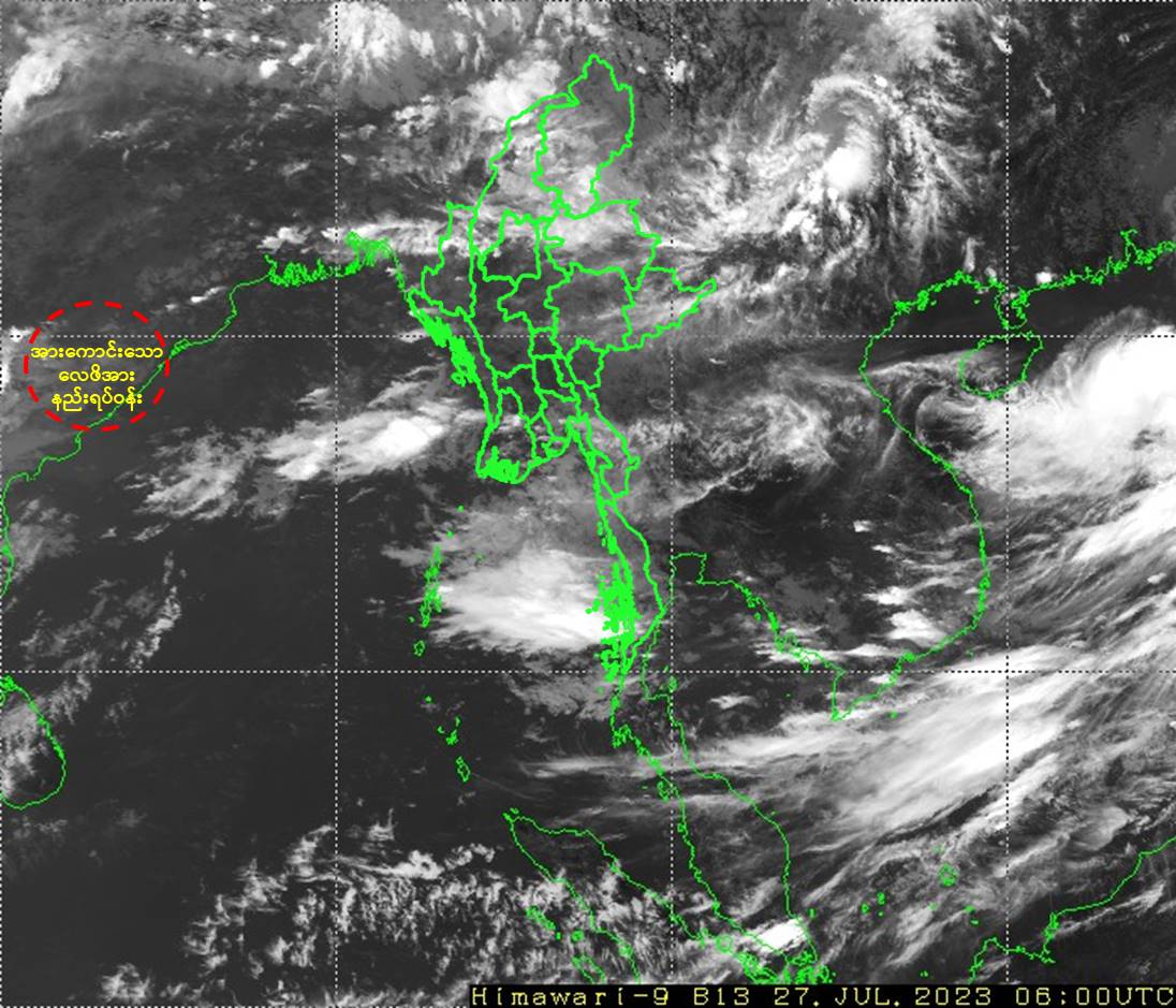 ဘင်္ဂလားပင်လယ်အော်အခြေအနေ။ ယနေ့မြန်မာစံတော်ချိန် (၁၂:၃၀)နာရီအချိန်တိုင်းထွာချက်များအရ ဘင်္ဂလားပင်လယ်အော်အနောက်အလယ်ပိုင်းနှင့် ယင်းနှင့် ဆက်စပ်လျက်ရှိသော ဘင်္ဂလားပင်လယ်အော်အနောက်မြောက်ပိုင်းနှင့် အိန္ဒိယနိုင်ငံ၊ အင်ဒရာပရာဒေ့ရှ်ပြည်နယ်မြောက်ပိုင်း - ဩရိဿပြည်နယ်တောင်ပိုင်းကမ်းခြေ တို့တွင် ဖြစ်ပေါ်နေသော အားကောင်းသောလေဖိအားနည်းရပ်ဝန်း(Well Marked Low Pressure Area)သည် အိန္ဒိယနိုင်ငံ၊ ဩရိဿပြည်နယ်တောင်ပိုင်းနှင့် ယင်းနှင့် ဆက်စပ်လျက်ရှိသော အင်ဒရာပရာဒေ့ရှ်ပြည်နယ်မြောက်ပိုင်းသို့ ဝင်ရောက်ခဲ့ပြီးဖြစ်ပါသည်။ ကပ္ပလီပင်လယ်ပြင်နှင့် ဘင်္ဂလားပင်လယ်အော်တို့တွင် မုတ်သုံလေ အားအသင့်အတင့်မှ အားကောင်းနေပါသည်။