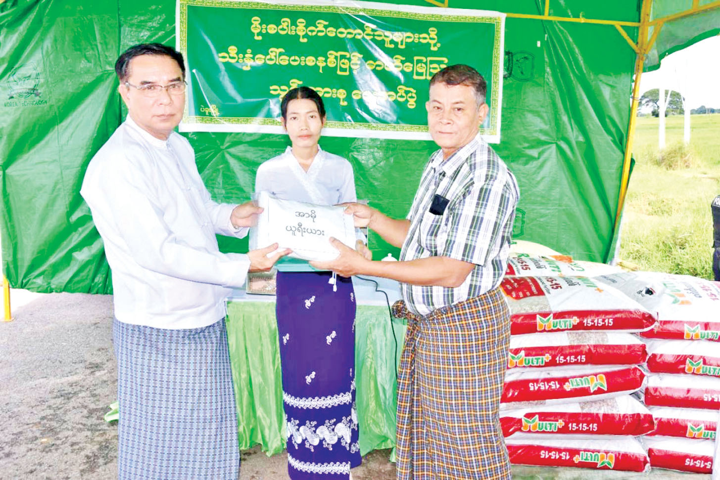 ပဲခူးမြို့ ကတွင်းခြံကျေးရွာအုပ်စု၌ စက်တင်ဘာ ၅ ရက်က ပဲခူးမြို့နယ်ရှိ မိုးစပါးစိုက်တောင်သူများသို့ သီးနှံပေါ်ပေးစနစ်ဖြင့် ဈေးနှုန်းသက်သာသော ဓာတ်မြေဩဇာများ ပေးအပ်ခြင်းအခမ်းအနားကို ကျင်းပသည်။