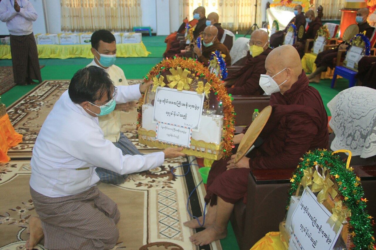 ထို့နောက် ဆရာတော် သံဃာတော် အရှင်သူမြတ်များအား တိုင်းဒေသကြီး ဝန်ကြီးချုပ် ဦးမျိုးဆွေဝင်း၊ တရားလွှတ်တော် တရားသူကြီးချုပ် ဒေါ်လွင်လွင်အေးကျော်နှင့် အစိုးရအဖွဲ့ တာဝန်ရှိသူများက ဝါဆိုသင်္ကန်းများနှင့် လှူဖွယ်ဝတ္ထုများ ဆက်ကပ်လှူဒါန်းကြပြီး သီလရှင်ဆရာကြီးများအား တိုင်းဒေသကြီး တရားလွှတ်တော်တရားသူကြီးချုပ်နှင့် အစိုးရအဖွဲ့ တာဝန်ရှိသူများ၏ ဇနီးများက သီလရှင်ဝတ်ရုံများ ဆက်ကပ်လှူဒါန်းကြသည်။