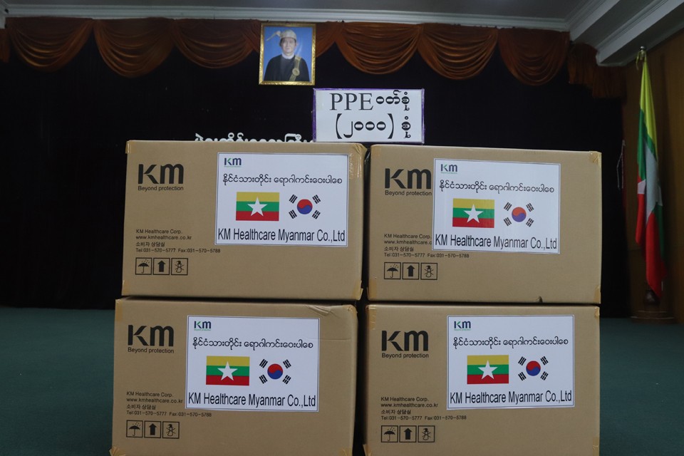 ရှေးဦးစွာ KM Healthcare Myanmar Co., Ltd, MD. Mr. Lee Dea Chun က ပဲခူးတိုင်းဒေသကြီးအတွင်း COVID-19 ကာကွယ်၊ ထိန်းချုပ်၊ ကုသခြင်းလုပ်ငန်းများတွင် အသုံးပြုနိုင်ရန်အတွက် Surgical Gown ဝတ်စုံများအား မိမိတို့ကုမ္ပဏီအနေဖြင့် လာရောက်ထောက်ပံ့ လှူဒါန်းရခြင်းဖြစ်ပါကြောင်း၊ တစ်ဘက်မှာလည်း နိုင်ငံတော်အတွက် လိုအပ်သော ကျန်းမာရေးအထောက်အကူပြုပစ္စည်းများ ထုတ်လုပ်ပေးလျက်ရှိပါကြောင်း၊ ထပ်မံ၍လည်း လိုအပ်လာပါက ပဲခူးတိုင်းဒေသကြီးအတွက် ကျန်းမာရေးသုံးပစ္စည်းများ ဆက်လက်ထောက်ပံ့ လှူဒါန်းပေးသွားမည်ဖြစ်ကြောင်း ပြောကြားပြီးနောက် KM Healthcare Myanmar Co., Ltd , MD. Mr. Lee Dea Chun နှင့် တာဝန်ရှိသူများက Surgical Gown ဝတ်စုံ ၂၀၀၀ အား ပေးအပ်ရာ ဝန်ကြီးချုပ် ဦးဝင်းသိန်းမှ ဂုဏ်ပြုမှတ်တမ်းလွှာ ပြန်လည်ပေးအပ်ခဲ့သည်။