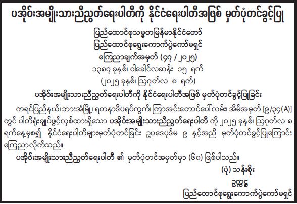 ပအိုဝ်းအမျိုးသားညီညွတ်ရေးပါတီကို နိုင်ငံရေးပါတီအဖြစ် မှတ်ပုံတင်ခွင့်ပြု
