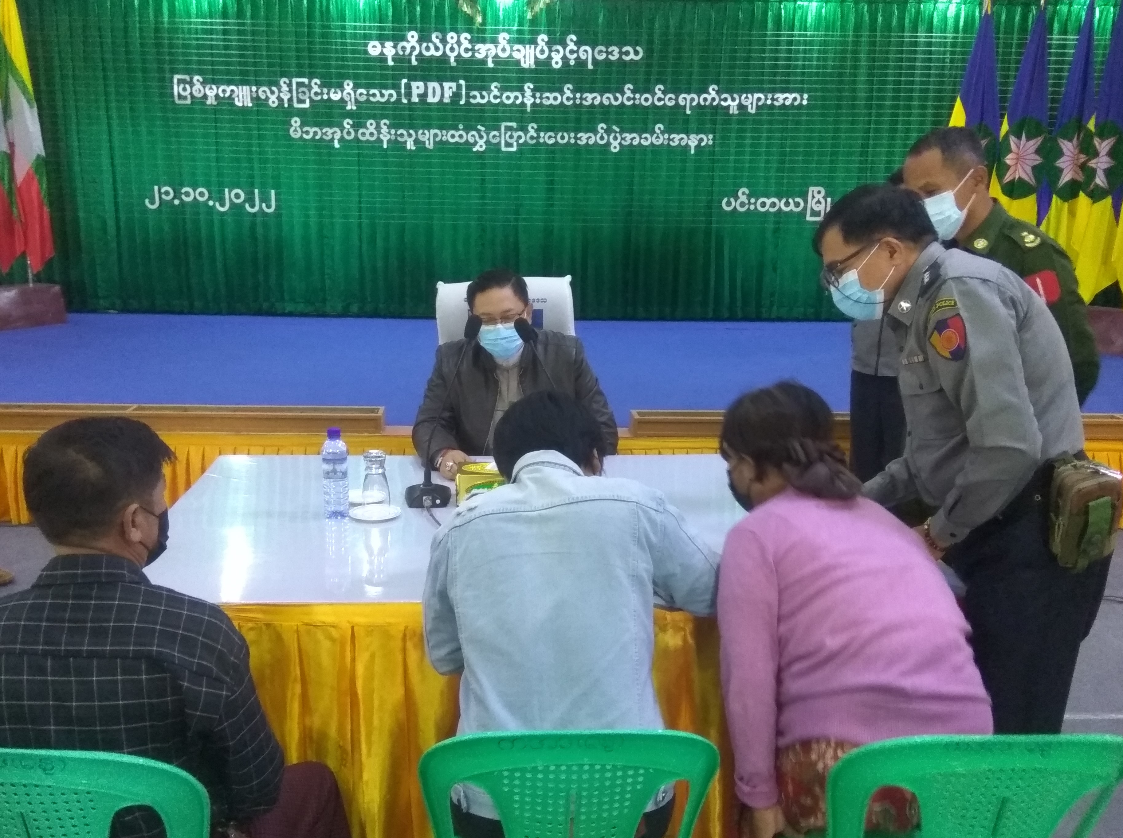 ပြစ်မှုကျူးလွန်ခြင်း မရှိသော PDF သင်တန်းဆင်း အလင်းဝင်ရောက်သူများအား မိဘအုပ်ထိန်းသူများထံ လွှဲပြောင်းပေးအပ်ခြင်းနှင့် ထောက်ပံ့ငွေ ပေးအပ်ခြင်းကို ရှမ်းပြည်နယ်(တောင်ပိုင်း)၊ ဓနုကိုယ်ပိုင် အုပ်ချုပ်ခွင့်ရဒေသ၊ ပင်းတယမြို့ရှိ ဓနုကိုယ်ပိုင်အုပ်ချုပ်ခွင့်ရဒေသ စီမံအုပ်ချုပ်ရေးရုံးအဖွဲ့ရုံး အစည်းအဝေးခန်းမ(၁)တွင် အောက်တိုဘာ ၂၁ ရက် နံနက်ပိုင်းက ကျင်းပခဲ့သည်။