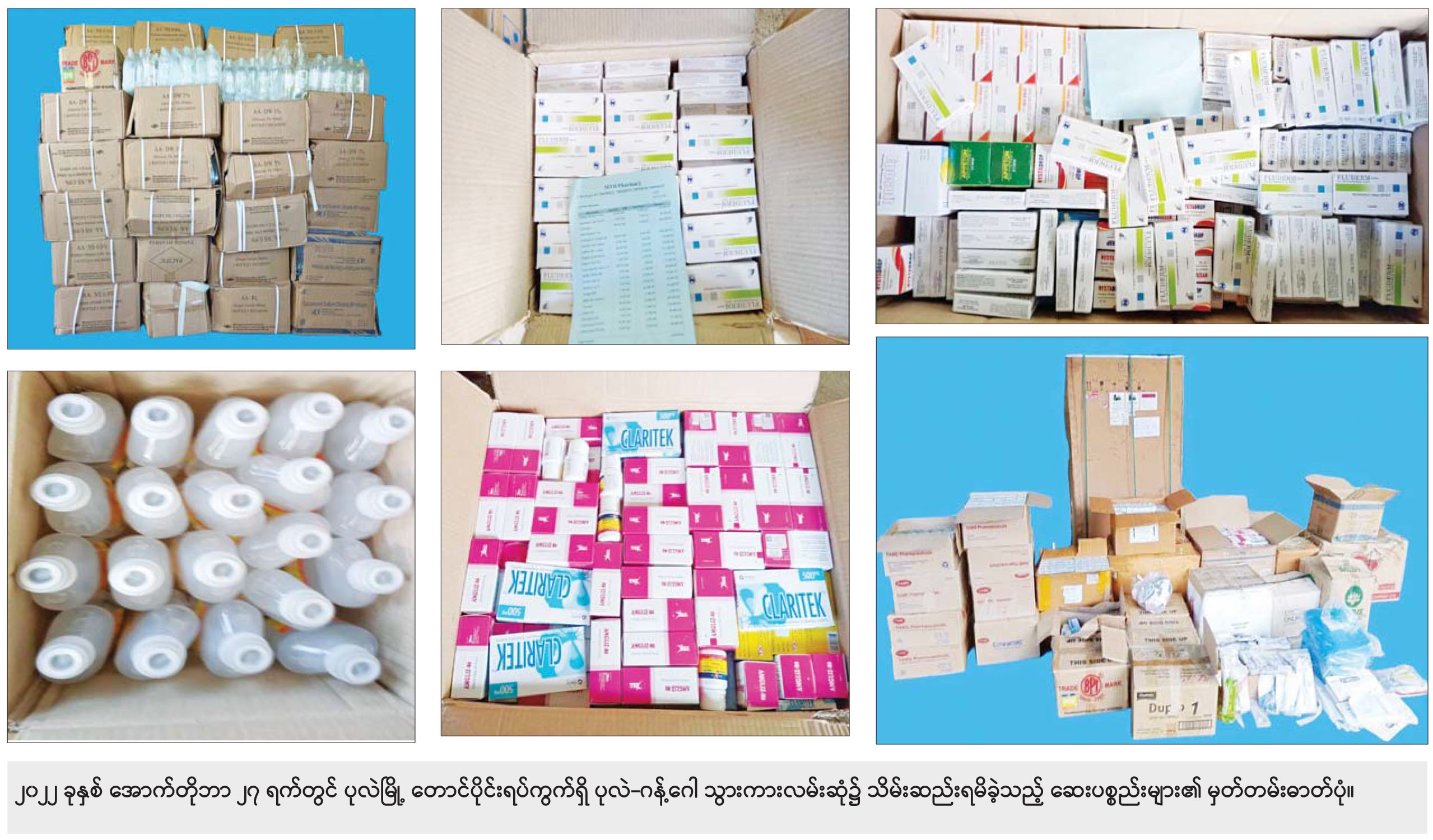 အကြမ်းဖက်အုပ်စုအဖြစ် ကြေညာထားသောCRPH၊ NUG နှင့် ယင်းတို့၏လက်အောက်ခံ PDF အမည်ခံ အကြမ်းဖက်အဖွဲ့များအား အားပေးကူညီလျက်ရှိသော လူပုဂ္ဂိုလ်များသည် နိုင်ငံတော် တည်ငြိမ်အေးချမ်းရေးနှင့် အစိုးရယန္တရားများ ပျက်ပြားစေရန် ရည်ရွယ်၍ ပြည်တွင်း/ ပြည်ပမှ အစွန်းရောက် အကြမ်းဖက်ထောက်ခံသူများထံမှ ငွေကြေးများ ကောက်ခံကာဆေးဝါးနှင့် ဆက်စပ်ပစ္စည်းများကို အကြမ်းဖက်အဖွဲ့များထံသို့ နည်းမျိုးစုံသုံး၍ ပေးပို့လျက်ရှိကြောင်း အကြမ်းဖက်မှုကို မလိုလားသော တာဝန်သိ ပြည်သူတစ်ဦး၏ သတင်းပေးတိုင်ကြားမှုကြောင့် ၂၀၂၂ ခုနှစ် အောက်တိုဘာ ၂၇ ရက်တွင် လုံခြုံရေးပူးပေါင်းအဖွဲ့သည် ပုလဲ - ဂန့်ဂေါသွား ကားလမ်းဆုံ၌ PDF အမည်ခံ အကြမ်းဖက် အဖွဲ့ဝင်များထံထောက်ပံ့မည့် တရားမဝင် ဆေးဝါးနှင့် ဆေးပစ္စည်းများ တင်ဆောင်၍ ယာဉ်မောင်း ကျော်လွင်ထက် (ခ) သားသား မောင်းနှင်ပြီး ယာဉ်နောက်လိုက် ခွာကျဲအို လိုက်ပါလာသည့် ခြောက်ဘီးယာဉ်ပေါ်မှ မေ့ဆေးစက် တစ်လုံး၊ ဆေးပစ္စည်းမျိုးစုံ ကတ်ထူဂျပ်ဖာ ၂၅ ဖာ၊ လျှပ်စစ် ပစ္စည်းဂျပ်ဖာ ၁၄ ဖာ၊ အဝတ် အထည်အိတ် ၂၀ ၊ အခြား လူ သုံးကုန်ပစ္စည်း မျိုးစုံ ၃၇ ဖာ (စုစုပေါင်း ကာလတန်ဖိုး ၄၈ သိန်းခန့်)တို့ကို သိမ်းဆည်းရမိခဲ့သည်။