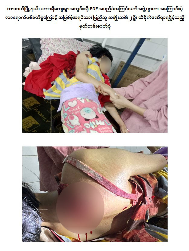 PDF အမည်ခံအကြမ်းဖက်သမားများက ထားဝယ်မြို့နယ်၊ ပကာရီကျေးရွာအတွင်းသို့ လက်လုပ်စိန်ပြောင်းဖြင့် အကြောင်းမဲ့ လာရောက်ပစ်ခတ်ခဲ့မှုကြောင့် အပြစ်မဲ့ အရပ်သား ပြည်သူ အမျိုးသမီး ၂ ဦး ထိခိုက်ဒဏ်ရာများရရှိ