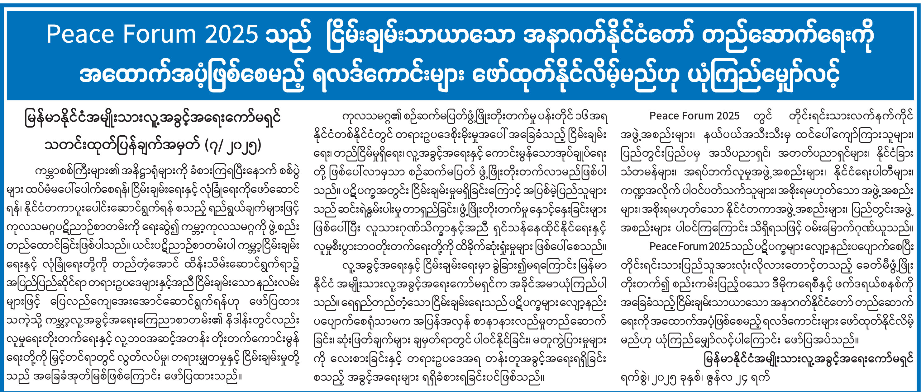 Peace Forum 2025 သည် ငြိမ်းချမ်းသာယာသော အနာဂတ်နိုင်ငံတော် တည်ဆောက်ရေးကို အထောက်အပံ့ဖြစ်စေမည့် ရလဒ်ကောင်းများ ဖော်ထုတ်နိုင်လိမ့်မည်ဟု ယုံကြည်မျှော်လင့်