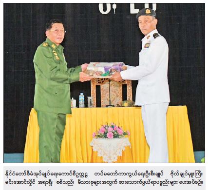 ယင်းနောက် နိုင်ငံတော်စီမံအုပ်ချုပ်ရေးကောင်စီဥက္ကဋ္ဌ တပ်မတော်ကာကွယ်ရေး ဦးစီးချုပ်က အရာရှိ၊ စစ်သည်၊ မိသားစုများအတွက် စားသောက်ဖွယ်ရာပစ္စည်းများကို ပေးအပ်ရာ နယ်မြေခံရေတပ်စခန်းဌာနချုပ်မှူးကလည်းကောင်း၊ နိုင်ငံတော်စီမံအုပ်ချုပ်ရေးကောင်စီဥက္ကဋ္ဌ တပ်မတော်ကာကွယ်ရေးဦးစီးချုပ်၏ဇနီးက တပ်နယ်မိခင်နှင့် ကလေးစောင့်ရှောက်ရေးအသင်းအတွက် ချီးမြှင့်ငွေများကိုပေးအပ်ရာ နယ်မြေခံ ရေတပ်စခန်းဌာနချုပ်၏ ဇနီးကလည်းကောင်း လက်ခံရယူကြသည်။