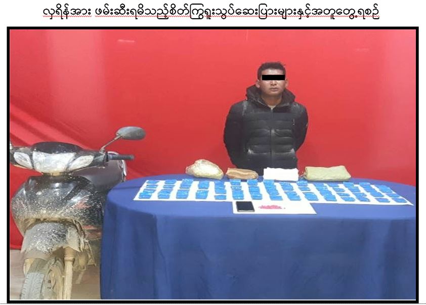 ဖားကန့်မြို့နယ်၊ ဆိပ်မူကျေးရွာအုပ်စု၊ ဆိုင်းအောင်ကျေးရွာအနီး၊ နမ့်မှော်-ဝှေခါ သွား ကားလမ်းတွင် မူးယစ်ဆေးဝါးတားဆီးနှိမ်နင်းရေးရဲတပ်ဖွဲ့မှတပ်ဖွဲ့ဝင်များ ပါဝင်သော ပူးပေါင်း အဖွဲ့သည် မူးယစ်ဆေးဝါးသတင်းအရ ယမန်နေ့က လှရိန် မောင်းနှင်လာသော မော်တော် ဆိုင်ကယ်အား ရပ်တန့်ရှာဖွေခဲ့သည်။