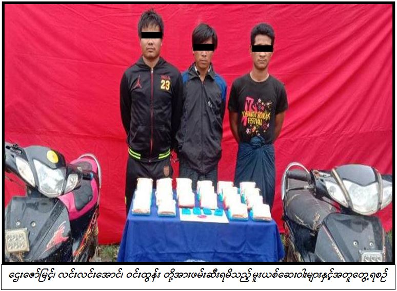 ယင်းသို့ ဖမ်းဆီးရမိသဖြင့် ဌေးဇော်မြင့် (၃၂) နှစ်၊ လင်းလင်းအောင် (၂၃) နှစ်၊ ဝင်းထွန်း (၃၂) နှစ် တို့အား မူးယစ်ဆေးဝါးနှင့် စိတ်ကိုပြောင်းလဲစေသော ဆေးဝါးများဆိုင်ရာ ဥပဒေအရ အရေးယူထားကြောင်း သိရသည်။