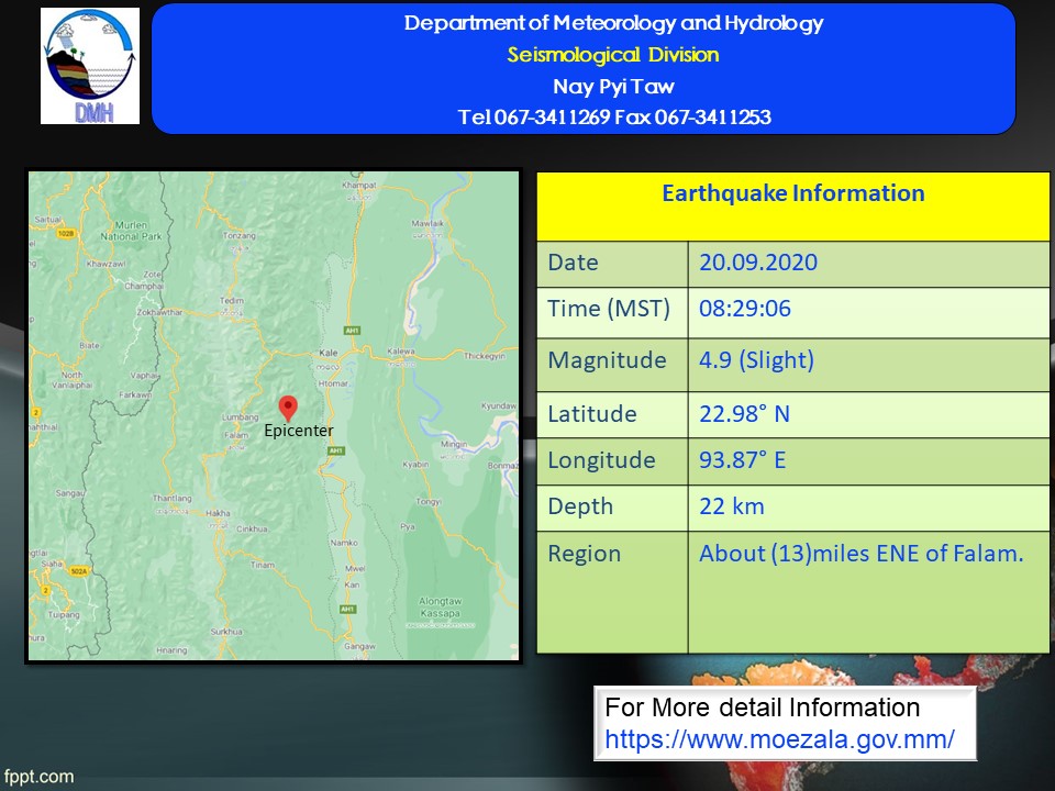 ယနေ့ နံနက် ၈ နာရီ ၂၉မိနစ်ခန့်တွင် ဟားခါးမြေငလျင်စခန်းမှ အရှေ့မြောက်ဘက် (၂၉)မိုင် ခန့်ကွာဝေးသော ဖလမ်းမြို့၏ အရှေ့-အရှေ့မြောက်ဘက် (၁၃)မိုင် ခန့်အကွာတွင် အင်အား ရစ်(ခ်)တာစကေး ၄ ဒသမ ၉ အဆင့်ရှိ အင်အားအနည်းငယ်ရှိသော မြေငလျင် တစ်ခု လှုပ်ရှားသွားကြောင်း သိရသည်။